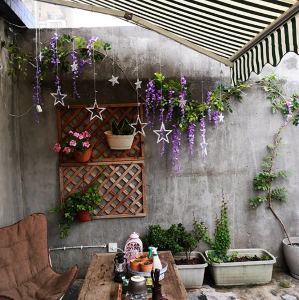 - Les fleurs sont en plastique, ce qui les rend durables et résistantes. Leur couleur est vive et attrayante, créant une atmosphère magique et romantique. Le long des rotins, les fleurs sont étalées de manière régulière, donnant un effet de densité et de beauté.