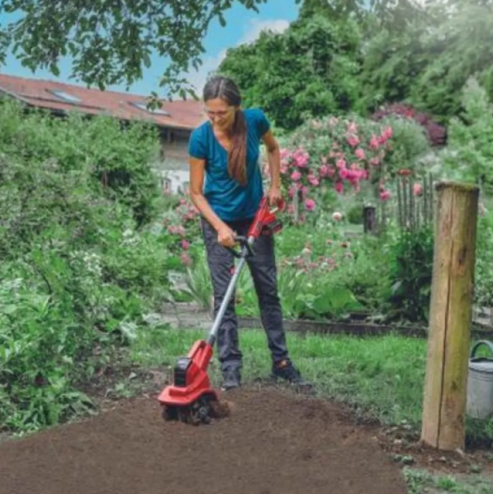 Motobineuse sans fil GE-CR 18/20 Li E SoloSystème Power X Change18VRégime : 230 trs/minLargeur de travail : 20 cmProfondeur de travail : 200 mm4 fraisesDiamètre lame de culture : 155 mmRevêtement SoftgripPoignée supplémentaire réglablePoignée de transportArbre séparableRégulateur de vitesseLivrée sans batterie ni chargeur