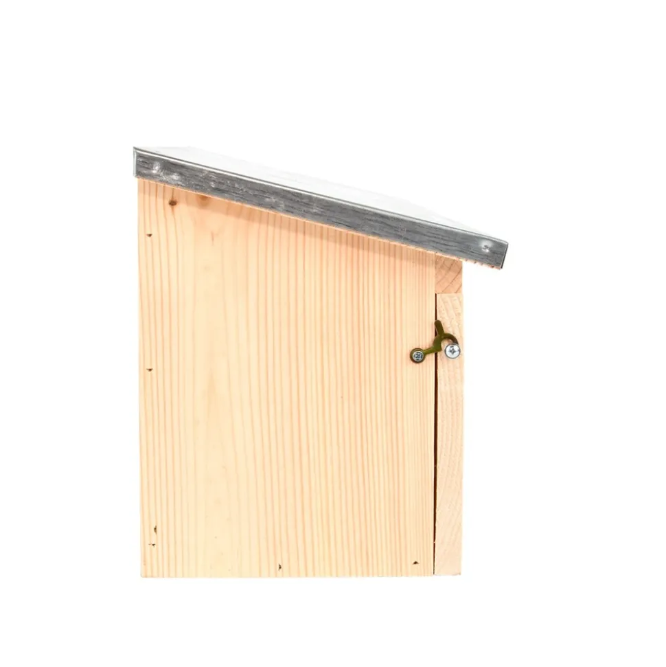 Un joli nichoir pour oiseaux fabriqué en bois de pin, avec un toit de zinc.