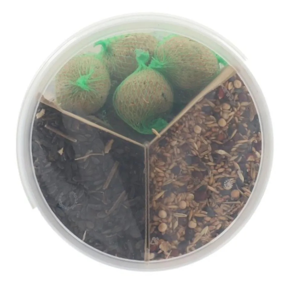 Composition détaillée :Graines à saupoudrer: Blé, pois commun, millet, avoine, maïs.Boules de graisse: Blé, suif de bœuf, viande bovine séchée en poudre, sorgho, millet, graines de tournesol.