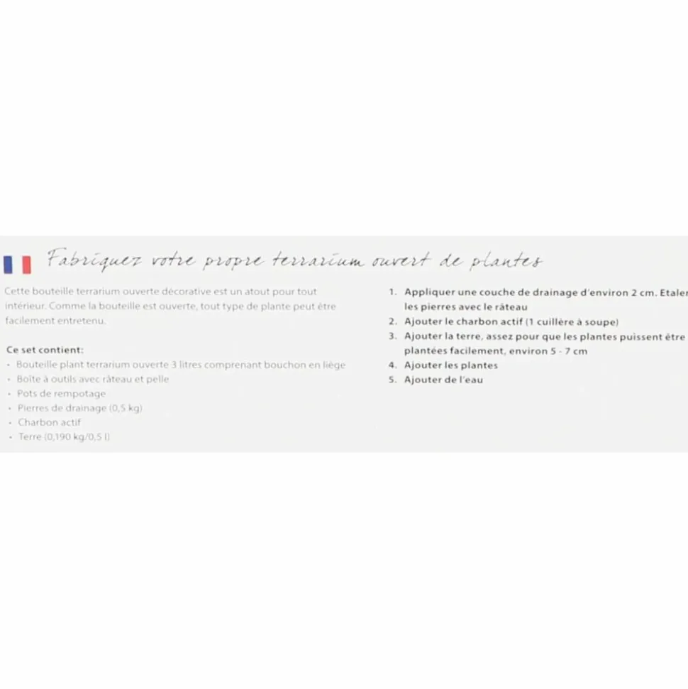 Dans ce kit complet terrarium DIY à faire soi-même vous retrouverez tout ce dont vous aurez besoin pour créer un terrarium végétal. La bouteille pour terrarium reste ouverte, cela veut dire que tout type de plante peut être aisément entretenu. Ce kit complet à faire soi-même se compose d’une bouteille de terrarium de 3 litres, de pots de rempotage, de terreau, de carbone, de pierres de drainage et d’un ensemble d’outils. Matériaux : Verre recyclé, pierres, terreau, acier inoxydable, PP, liège, charbon Poids brut : 2,453 kg