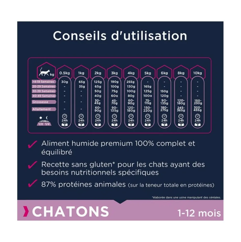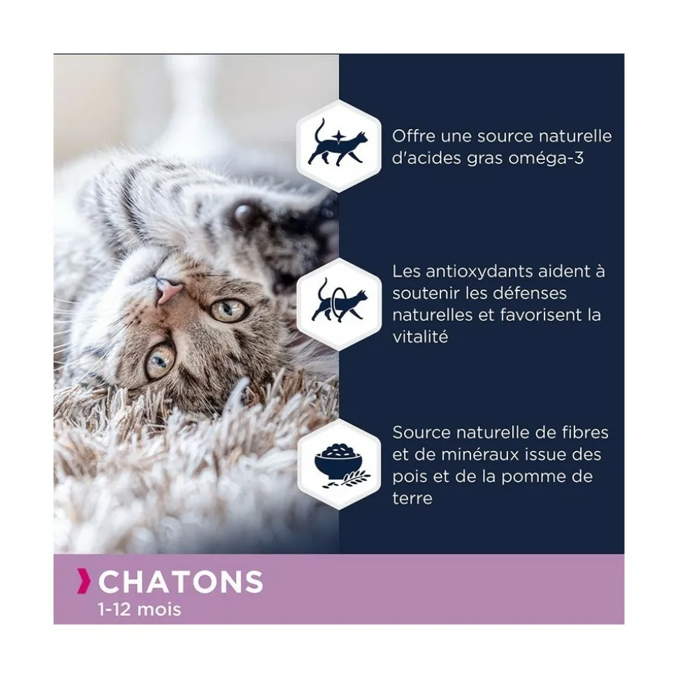 Croquettes sans céréales riches en saumon spécialement conçues pour les chatons. La haute teneur en protéines animales contribue au développement d’une musculature svelte. Recette enrichie en taurine favorisant la santé cardiovasculaire.