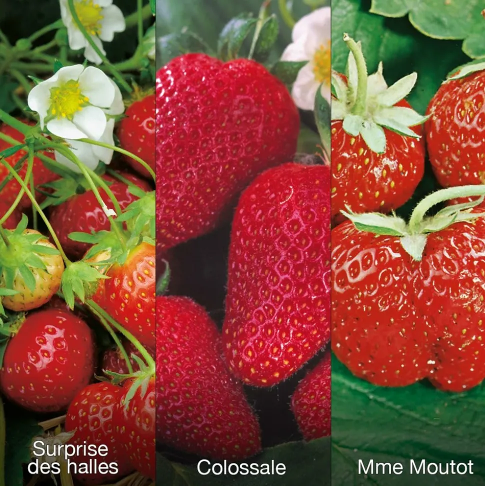 Découvrez 60 fraisiers : 20 Surprise des halles + 20 Colossale + 20 Mme Moutot. Juin à juillet. Qualité CEE-CAC. Un choix professionnel : variétés sélectionnées pour leurs facilités de culture et leurs qualités culinaires. Fraisier non remontant : une récolte par an en mai/juin, gros fruits, assurez-vous de bonnes récoltes. Plantez une nouvelle variété chaque année et remplacez-la régulièrement tous les deux ans.… Glissez vers le bas pour plus d’informations et pour découvrir comment planter puis entretenir vos fraisiers