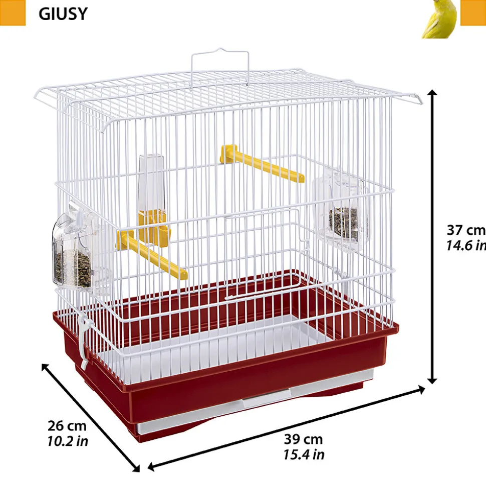 Cage pour canaris et petits oiseaux exotiques livrée avec accessoires : perchoir, abreuvoir et mangeoire. Barreaux métalliques et fond en plastique. Facilité d’entretien et de nettoyage grâce au plateau coulissant. Le support en plastique est disponible en accessoire.