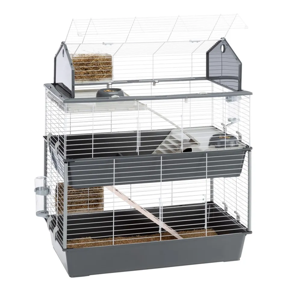 Offrez à vos lapins un habitat exceptionnel avec la Cage Barn 100 double, pensée pour favoriser leur bien-être. Fabriquée en plastique recyclé en Europe. Conçue pour accueillir vos lapins sur trois niveaux connectés par deux échelles, cette cage offre un grand espace de vie permettant à vos animaux de s’épanouir tout en explorant et en exerçant leurs muscles. Les équipements inclus garantissent un confort optimal : Trois étages reliés par deux échelles robustes, deux rateliers à foin, une maisonnette et une mangeoire.