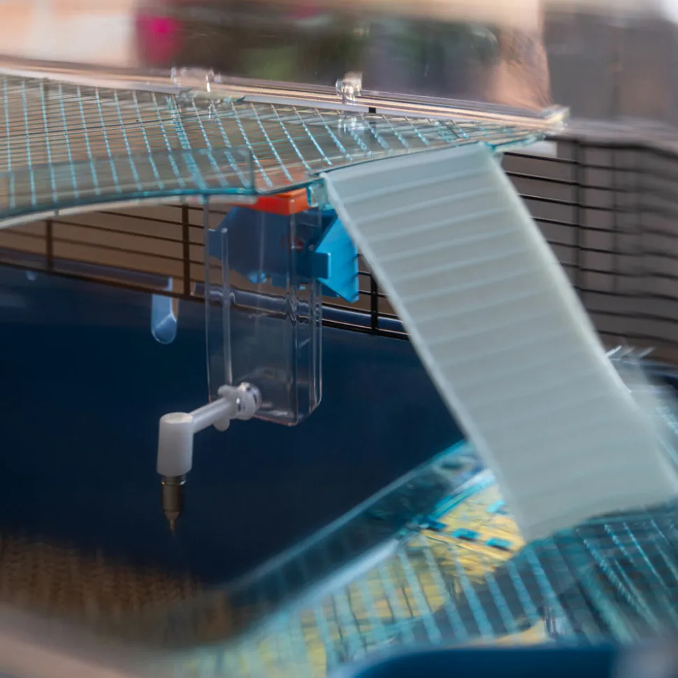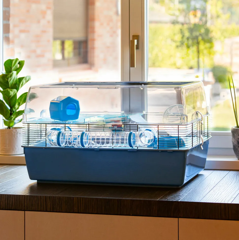 Cage modulable avec grand espace de vie pour hamsters et sourisElle se compose d’un grand fond et d’un couvercle en plastique transparent Toit en grille métallique peinte, relevable et verrouillable au moyen de crochetsBase et couvercle facilement détachables pour le nettoyage interneAccessoires inclus : 1 mangeoire, 1 abreuvoir, 2 étagères, 1 échelle, 1 jeu de tubes, 1 roue et 1 maisonnettePrédisposée pour un raccordement avec d’autres cages ou modules d’habitation