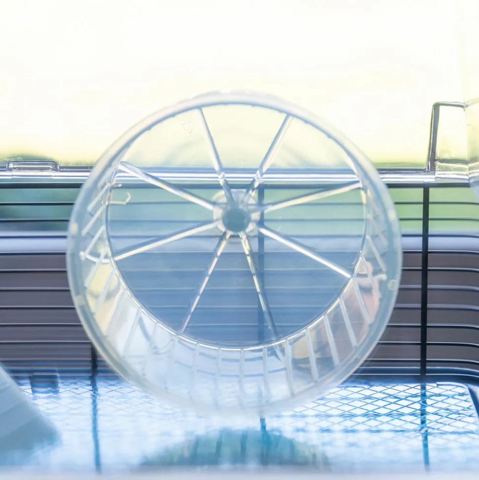 Grand espace de vie. L’intérieur spacieux est construit sur trois niveaux, reliés par deux échelles et est équipé de tout le nécessaire : une mangeoire et un abreuvoir, une maisonnette de repos et une roue.