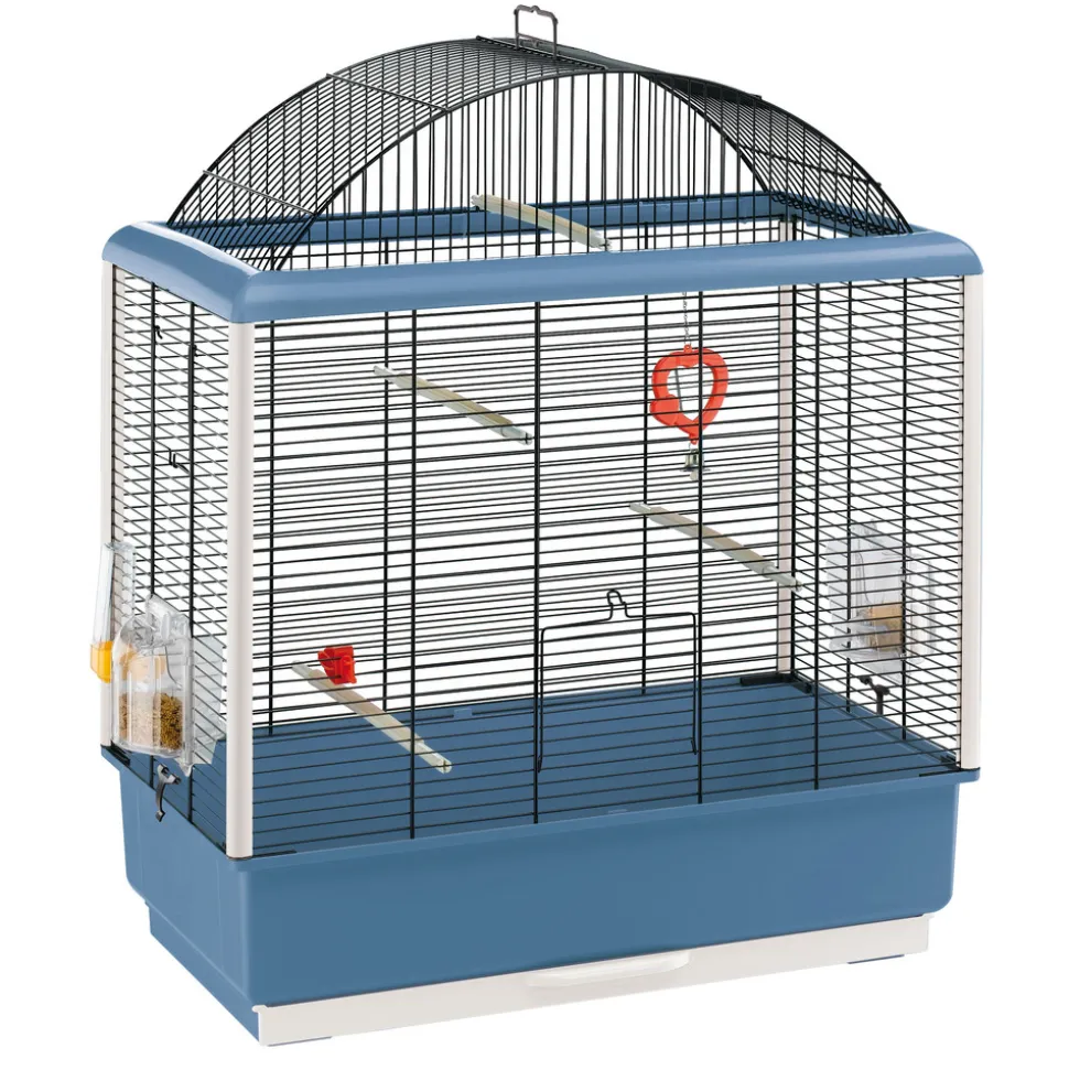 Cage pour oiseaux exotiques et canaris avec un design raffiné et élégant avec toit panoramique. Fourni dans un emballage peu encombrant. Facile à assembler. Fabriquée en métal robuste peint avec le bac en plastique rigide. Profils en plastique dans les coins et sur le cadre supérieur. Plateau amovible pratique pour recueillir la saleté, nettoyage et entretien faciles. Équipée d’une poignée pratique sur le dessus et d’une porte d’accès avec un verrou de sécurité. Equipée d’un abreuvoir extérieur, pinces pour légumes, perchoirs extensibles et miroir avec cloche Inclus deux mangeoires pivotantes tournantes Brava 2 : conçues pour être pivotées à 180 degrés et remplies de l’extérieur, ne laissant aucune ouverture et éviter ainsi que l’oiseau ne s’échappe