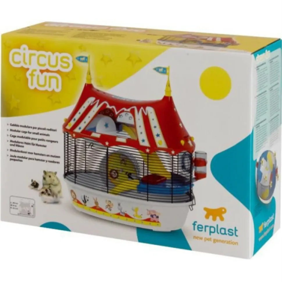 Offrez a votre hamster une cage ludique en forme de cirque ! Cette cage en plastique et fer est livrée avec tous les accessoires indispensables : maisonnette, roue, échelle, étage, mangeoire et abreuvoir. Elle mesure 49,5x34x42,5 cm et est de couleur rouge.