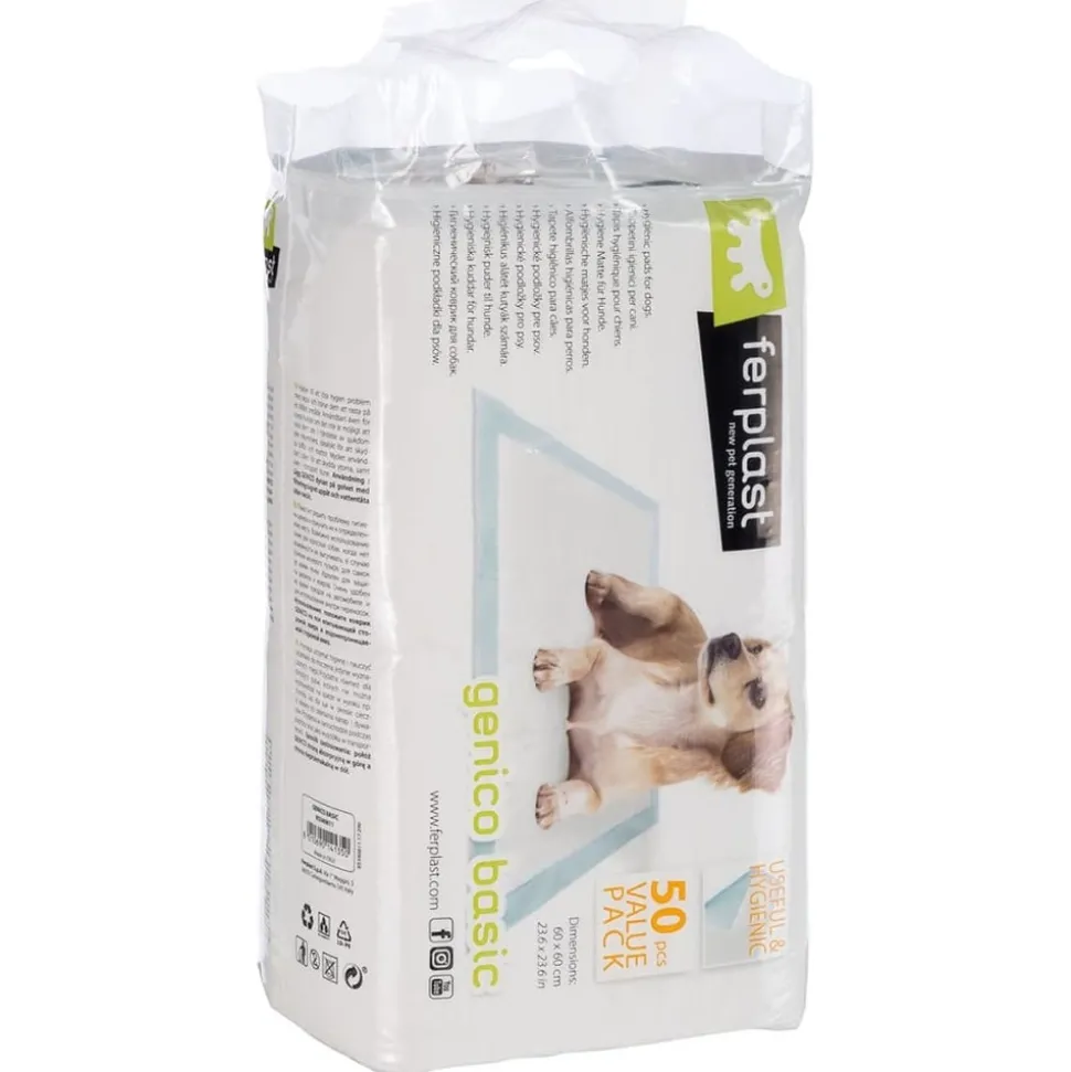 Genico Basic est un tapis hygiénique absorbant pour chiens, idéal pour éduquer les chiots à n’utiliser que certains espaces pour leurs propres besoins. Aussi fonctionnel pour les chiens adultes ou malades en convalescence, incontinent ou pour les femelles pendant le cycle. Pratique et utile en voyage et à la maison, dans les paniers de transport, sur les sièges de la voiture, les fauteuils ou les canapés. Fabriqué en polymères absorbants et équipé d’adhésifs pour la fixation au sol. Il s’utilise en l’étalant avec la partie filtrante vers le haut et la partie étanche vers le bas. Il est disponible au format 60×60 cm en pack de 50 pièces.