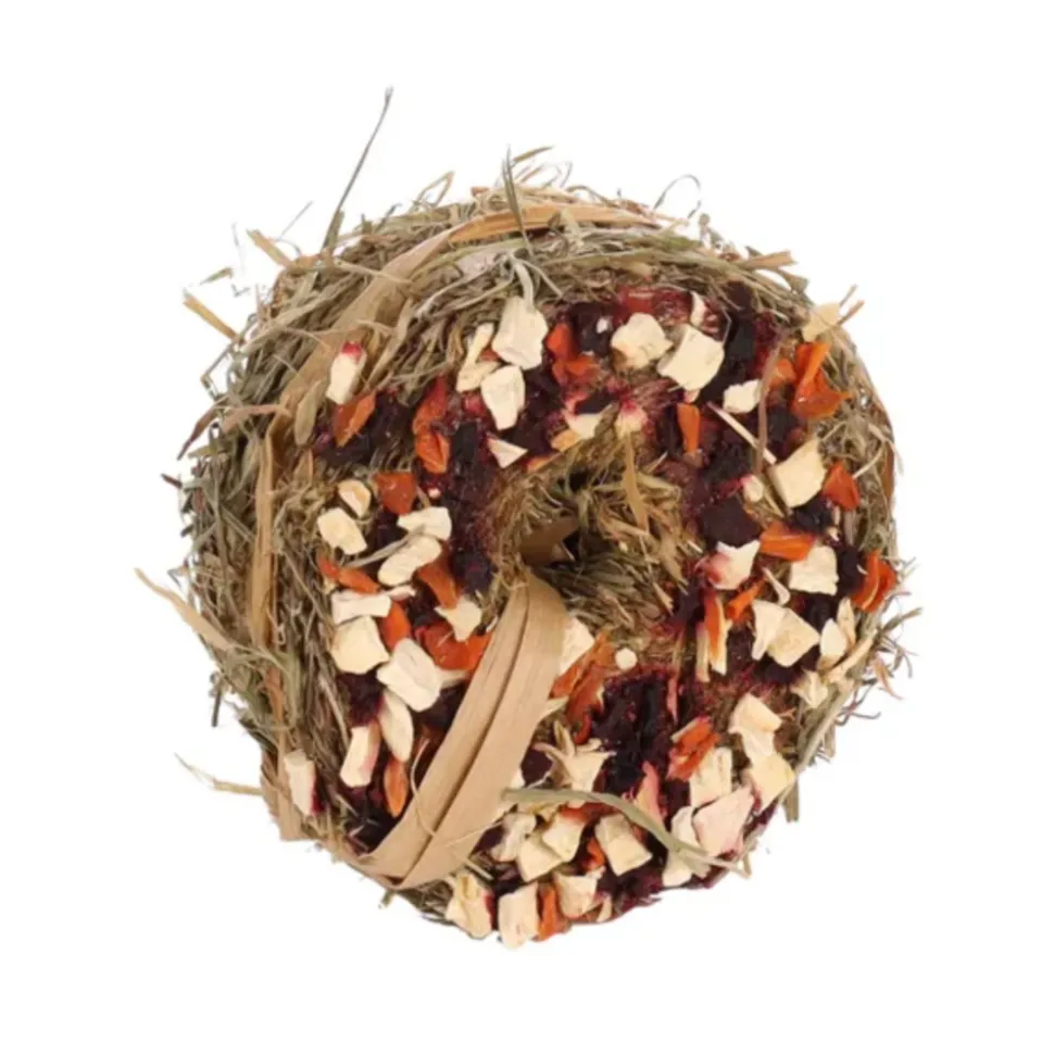 Faites plaisir à votre compagnon en lui offrant un donut gourmandFoin avec un mélange de soucis et de roses ou avec un mélange de betterave, carotte et panaisLa corde est en cellulose, le rouleau de foin est donc complètement comestibleSans céréales et sans sucres ajoutésSans colorants ou conservateurs artificielsSuspension facile