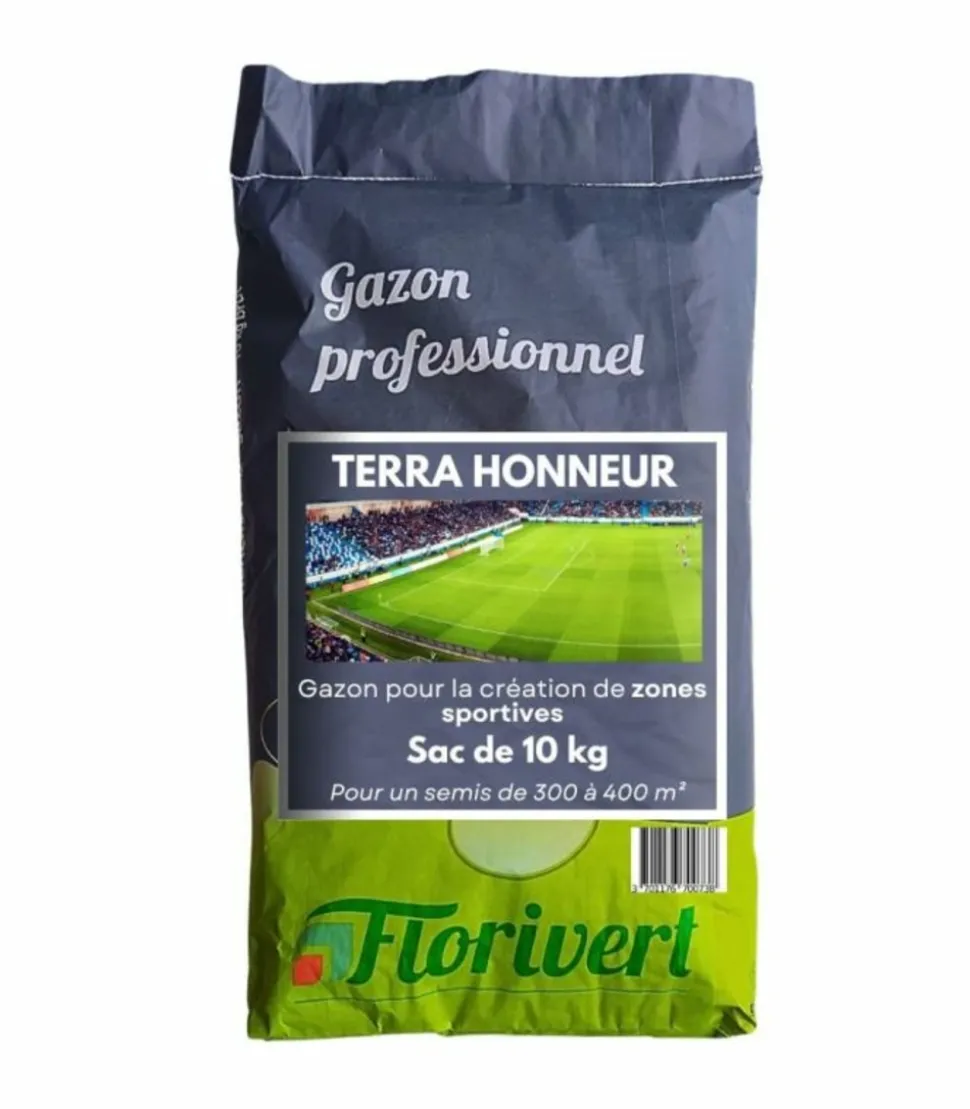 Le gazon Terra Honneur de Florivert est spécialement conçu pour la création de zones sportives de haut niveau. Il offre une excellente densité et tolère les tontes très courtes, ce qui le rend parfaitement adapté aux terrains sollicités comme les terrains de football, de rugby et d’athlétisme. Ce gazon est également labellisé Pelouse Éco Durable, soulignant ainsi son impact réduit sur l’environnement grâce à la réduction des déchets de tontes.