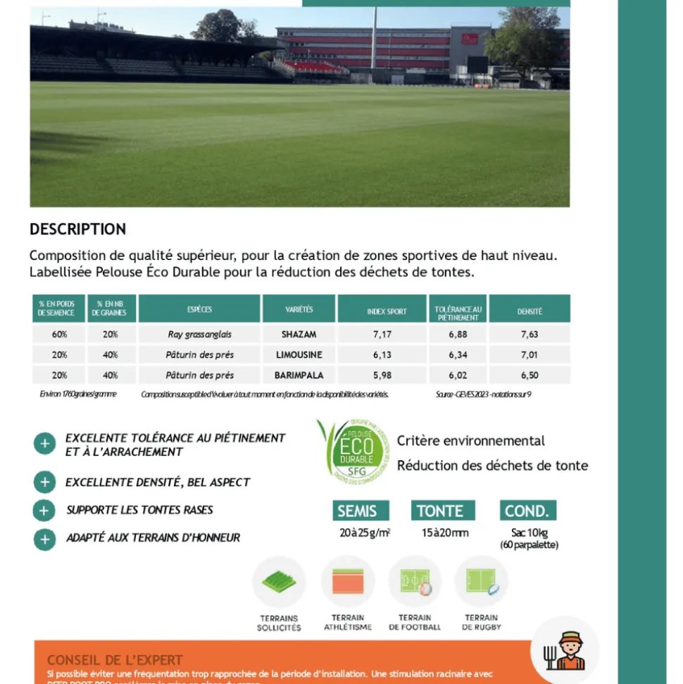 Le gazon Terra Honneur se distingue par sa capacité à supporter des tontes très courtes (15 à 20 mm), ce qui le rend particulièrement adapté aux terrains sportifs de haute qualité. Sa densité de semis recommandée est de 20 à 25 g/m², assurant une couverture uniforme et dense du sol. Grâce à sa composition équilibrée, il offre une tolérance au piétinement optimale, avec une note de 7,17 sur 9, garantissant une résistance idéale face aux sollicitations intensives.