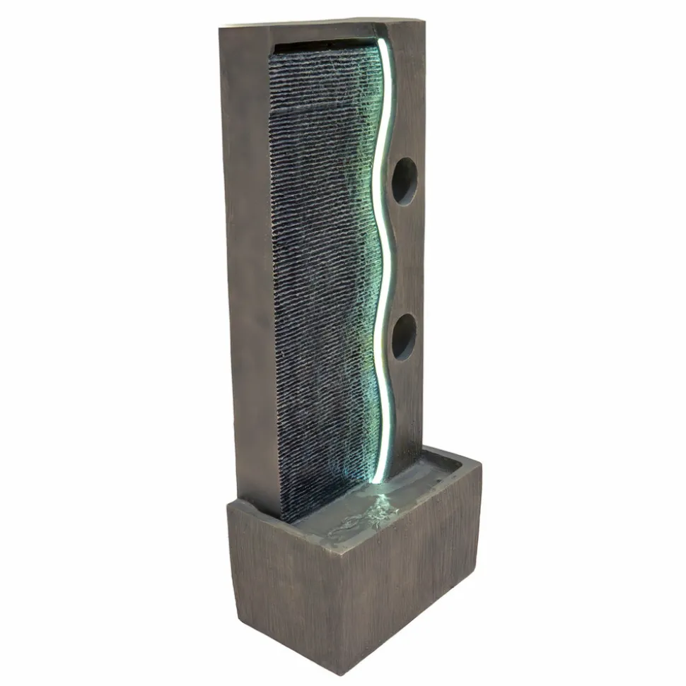 Avec sa forme minimaliste, son mur d’eau texturé et son éclairage LED discret, cette fontaine saisissante transforme jardin, terrasse ou balcon en un lieu de retraite paisible et de contemplation.