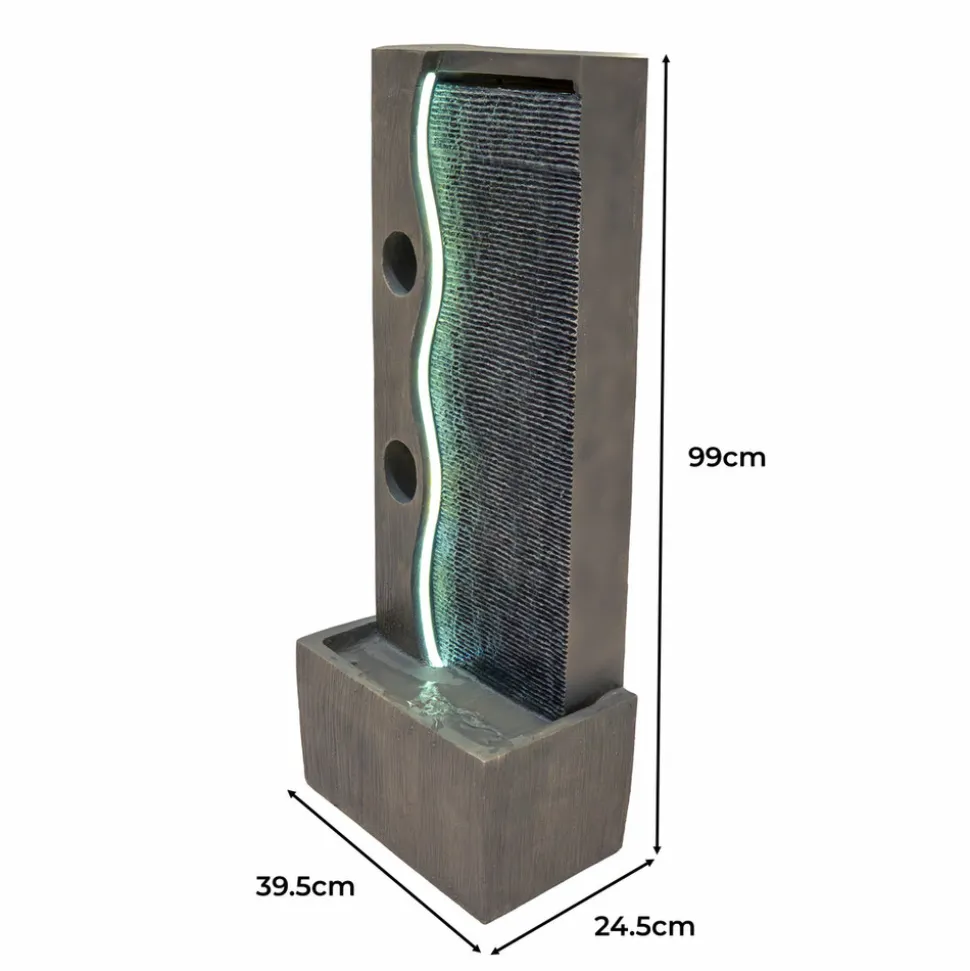 Fabriquée en polyresine résistante aux intempéries, la Harmony Falls est conçue pour durer tout en conservant une finition proche de la pierre naturelle. L’eau s’écoule délicatement le long du panneau central rainuré, produisant un son doux et apaisant qui invite à la relaxation.