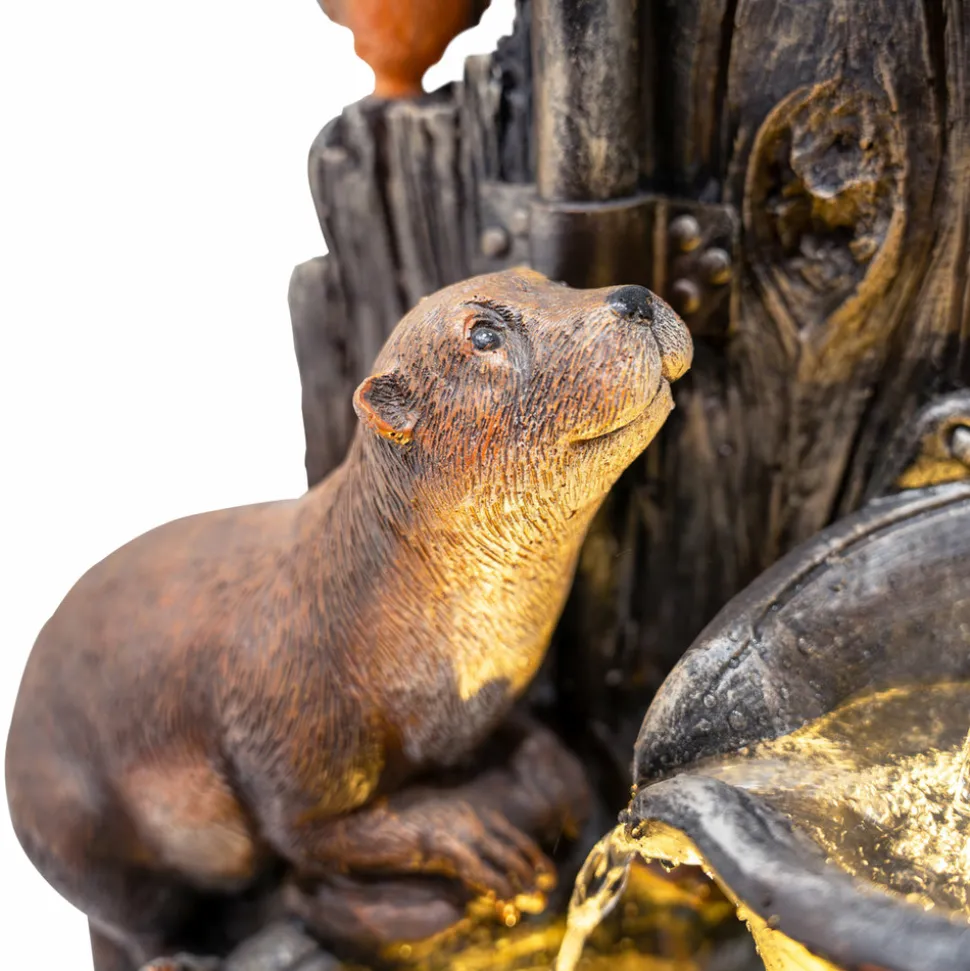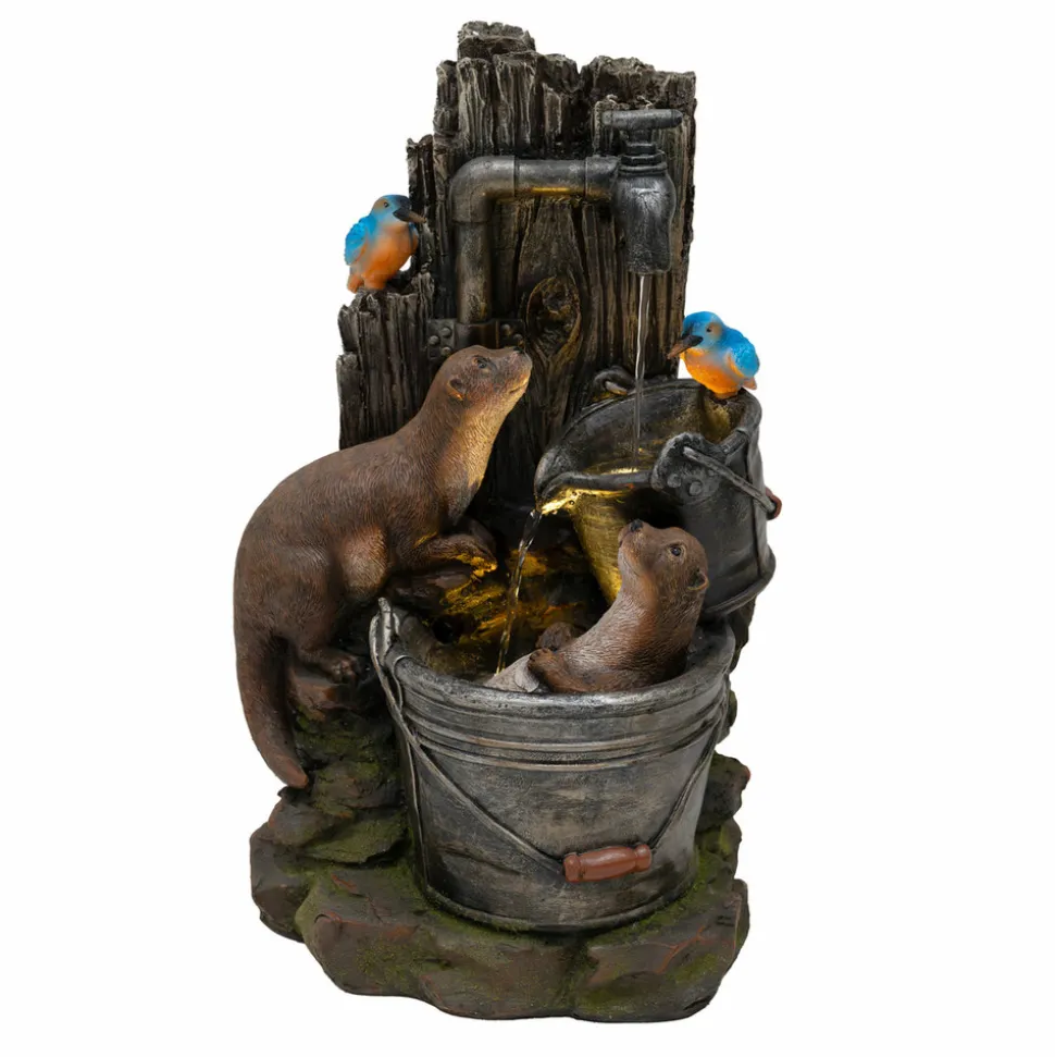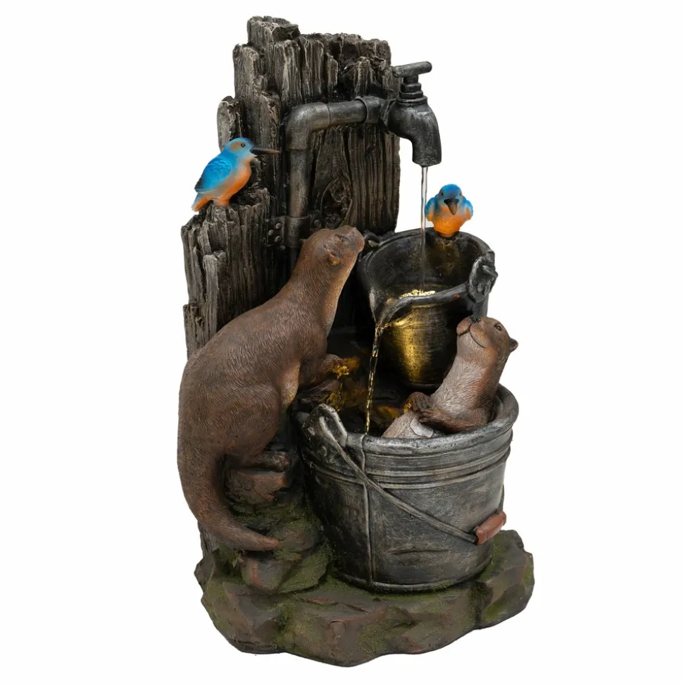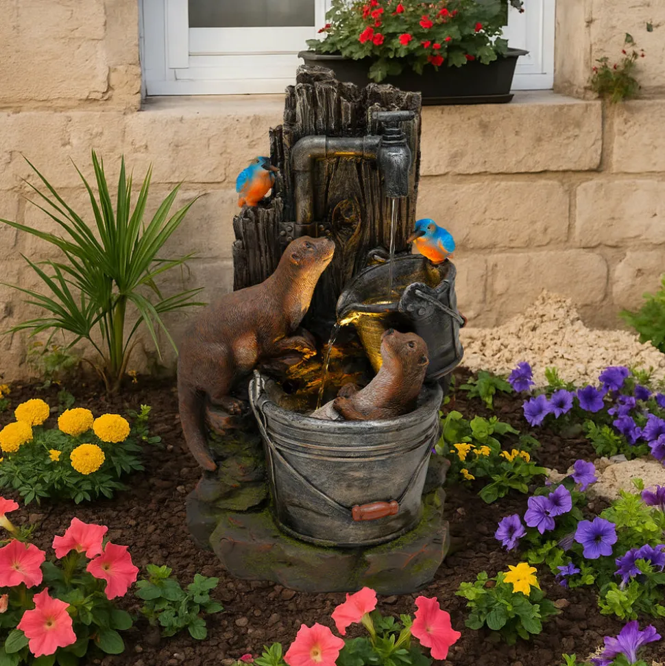 Conçue avec expertise en polyresine durable et résistante aux intempéries, la fontaine « Otter Oasis » se distingue par ses textures soignées et ses détails réalistes, du fond rustique en bois à la fourrure fidèle des loutres en passant par le plumage éclatant des oiseaux. L’une des loutres est représentée de manière charmante en train de se baigner dans un seau rustique pendant que sa compagne l’observe avec curiosité, ajoutant une touche fantaisiste et vivante à la scène. L’eau s’écoule depuis un bec verseur situé en hauteur jusque dans les seaux pittoresques, tandis que deux lumières LED blanc chaud diffusent une lueur douce et accueillante, mettant en valeur l’eau en mouvement et animant l’ensemble, notamment à la tombée de la nuit.