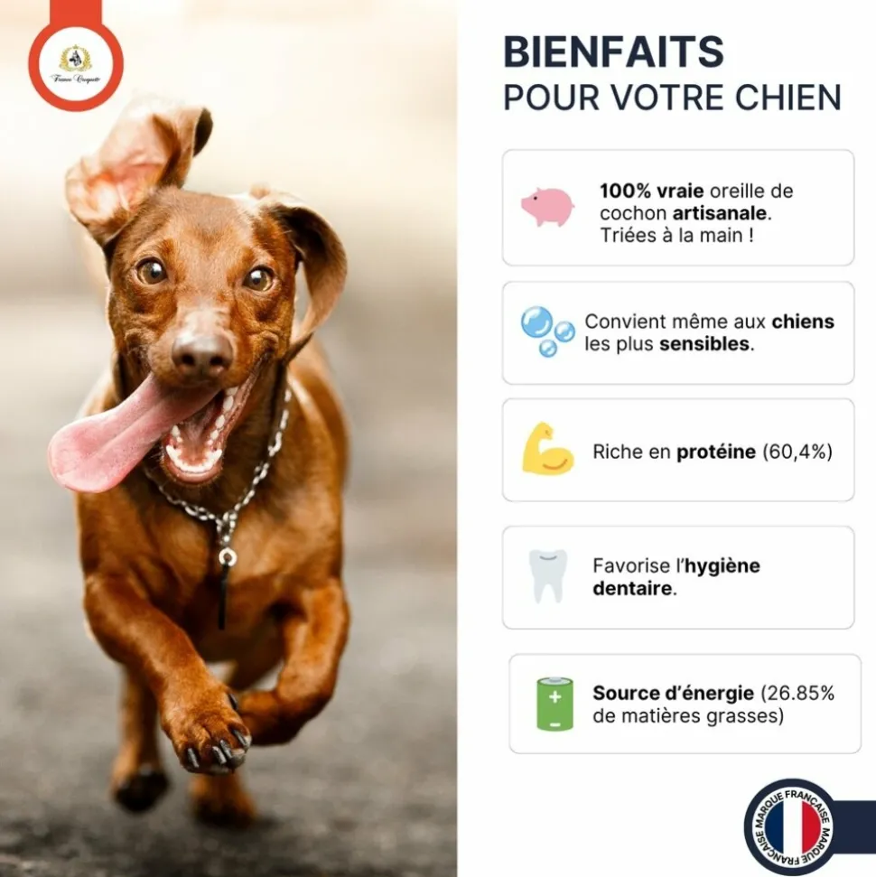 Offrez à votre chien une friandise naturelle d’une qualité exceptionnelle, issue du circuit court. Nos oreilles de porc sont rigoureusement sélectionnées une à une, puis séchées lentement pour préserver leur saveur authentique, leur croustillant naturel et tous leurs bienfaits.