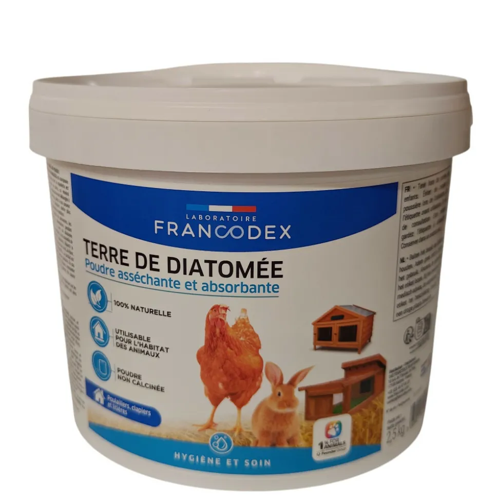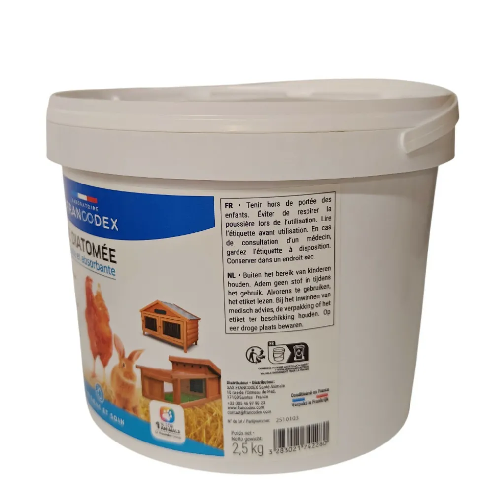 Terre de diatomée 2,5kg pour poulaillers, clapiers et litièresLa Terre de diatomée est une poudre minérale issue de micro-algues fossilisées riches en silice.Cette substance naturelle forme de minuscules cristaux aux propriétés ultra-absorbantes.Une fois ajoutée à la litière, elle capture l’humidité, prolonge la fraîcheur et la propreté du bac et limite le développement des mauvaises odeurs.Son efficacité repose sur sa structure microporeuse, qui permet de maintenir un environnement sec pour le confort des animaux.Produit recommandé en extérieur.Parfaitement adaptée à un usage extérieur (enclos, abris, zones de passage).Seau de 2.5 kgComposition 100% terre de diatomée.Terre de diatomée 2,5kg pour poulaillers, clapiers et litièresLa Terre de diatomée est une poudre minérale issue de micro-algues fossilisées riches en silice.Cette substance naturelle forme de minuscules cristaux aux propriétés ultra-absorbantes.Une fois ajoutée à la litière, elle capture l’humidité, prolonge la fraîcheur et la propreté du bac et limite le développement des mauvaises odeurs.Son efficacité repose sur sa structure microporeuse, qui permet de maintenir un environnement sec pour le confort des animaux.Produit recommandé en extérieur.Parfaitement adaptée à un usage extérieur (enclos, abris, zones de passage).Seau de 2.5 kgComposition 100% terre de diatomée.Mode d’emploi