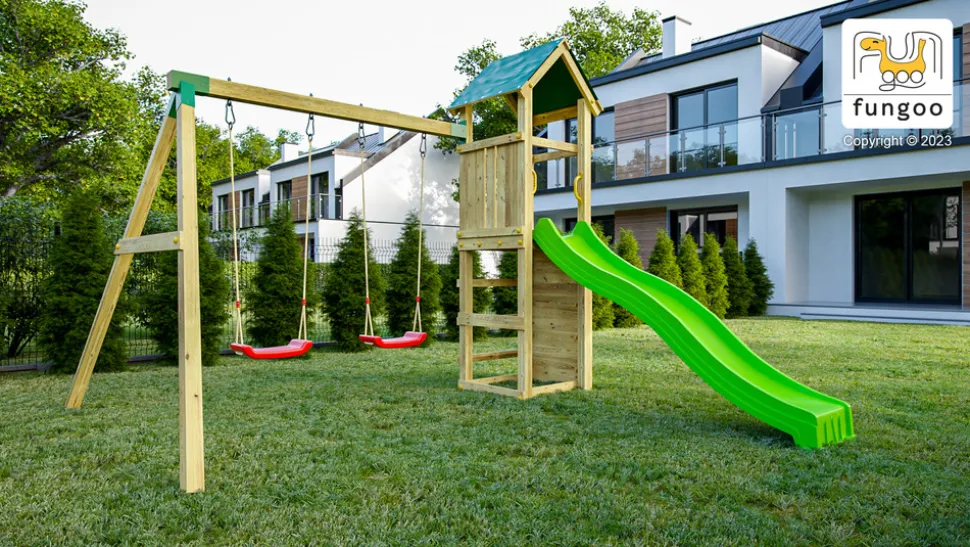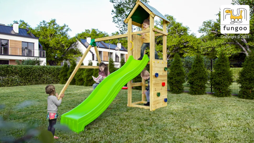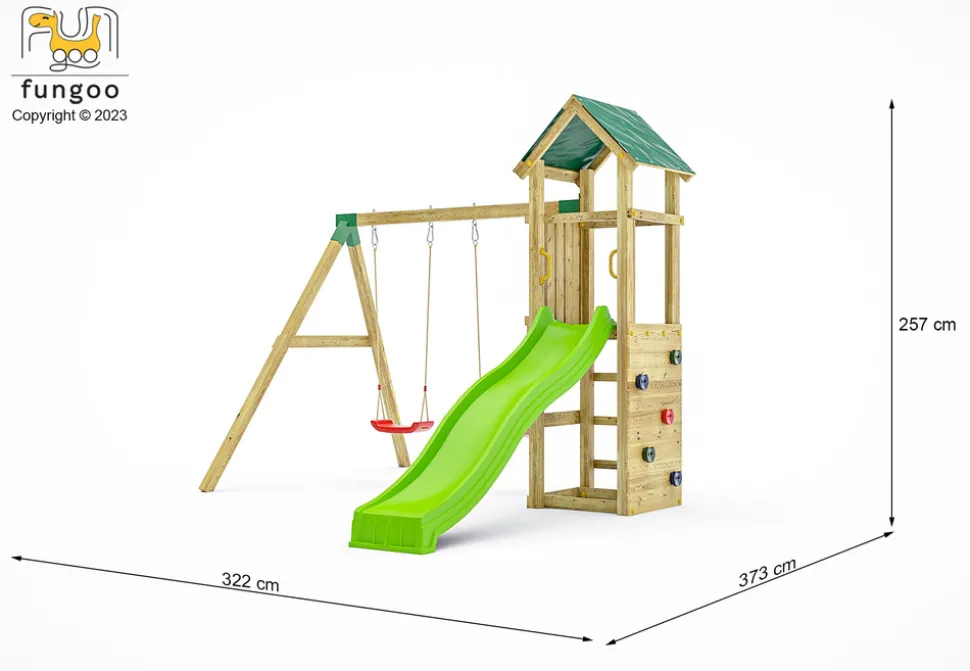 Transformez votre jardin en un véritable terrain d’aventures avec cette aire de jeux complète ! Elle comprend un toboggan vert de 2,2 m, un mur d’escalade, un bac à sable avec sièges, et deux balançoires rouges. Fabriquée en Pin Sylvestre FSC traité autoclave, cette structure est robuste et durable. Le montage est simple avec les connecteurs et outils inclus, pour une installation en 6 heures (2 personnes). Dimensions : 3,45m (L) x 2,84m (l) x 2,1m (h) et une surface de 9,8 m2 pour 6 enfants maximum. Garantie 10 ans.