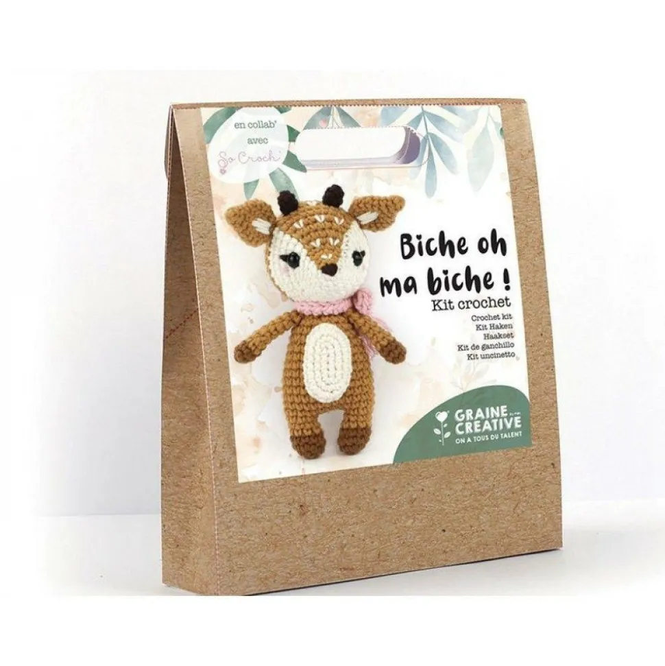 Découvrez ce coffret complet, pour réaliser vous-même une petite biche en crochet. Idéal comme cadeau à offrir, même pour les débutants, toutes les étapes sont détaillées dans le mode d’emploi. Le résultat final fait également un très beau cadeau de Naissance pour bébé. A l’intérieur du coffret, vous trouverez : 5 petites pelotes de laine, 1 crochet de Ø 3,5 mm, 1 aiguille à coudre, de la ouate de rembourrage, 2 petits yeux en plastique noirs, 2 anneaux marque maille. Une fois terminée, votre petite biche mesure 17 cm environ.