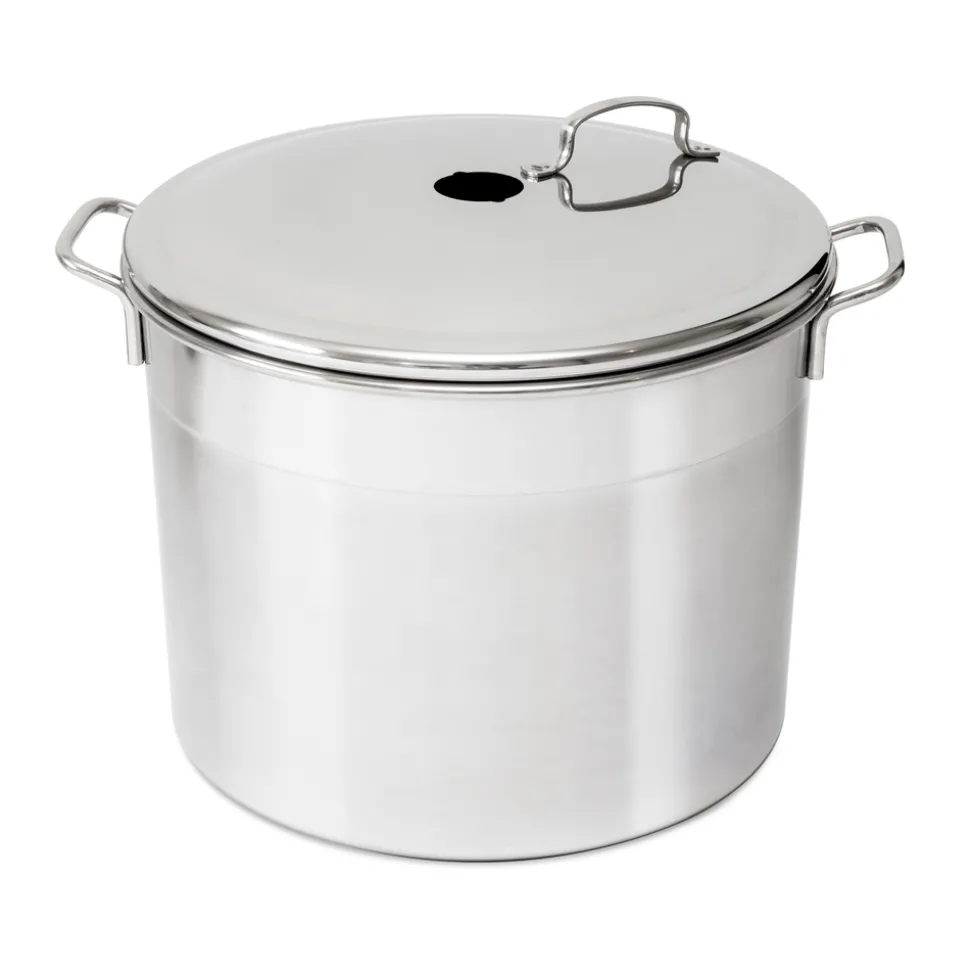Redécouvrez le bonheur authentique et les gestes hérités de nos aïeux en faisant vos propres conserves et confitures maison. Vous aurez la joie de partager avec vos proches la production de votre jardin toute l’année, sans oublier le bénéfice de faire des économies non négligeables. Pour leur bonne conservation sur le long terme, stockez vos délicieuses préparations et confitures dans des bocaux en verre que vous aurez préalablement lavés et stérilisés. Vous devez disposer d’un bouilleur de très bonne qualité pour pouvoir assurer à vos bocaux une stérilisation totale et fiable. En choisissant ce bouilleur en acier inoxydable né du savoir faire de la maison Guillouard, vous disposerez d’un équipement parfaitement adapté et grâce auquel la réussite de toutes vos recettes sera assurée. En acier inox couleur aluminium, votre bouilleur est facile à entretenir. Un simple lavage au liquide vaisselle à la main suffit après chaque utilisation. Faîtes le bien sécher après rinçage avant de faire bouillir une nouvelle série de pots pour stérilisation. Bouilleur en acier inoxydable pour stériliser 6 bocaux – L. 37.5 l. 43.5 H. 33.0 D. 35.0 cm – 24 litres.
