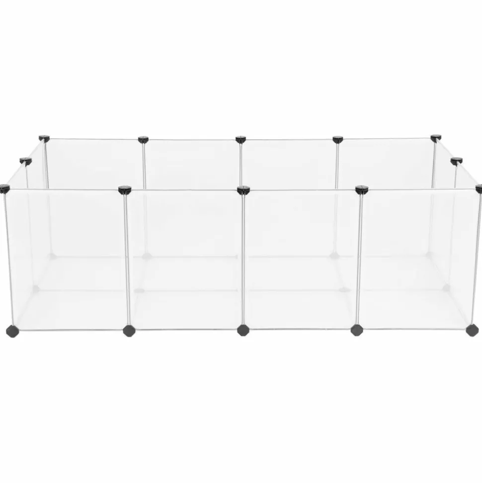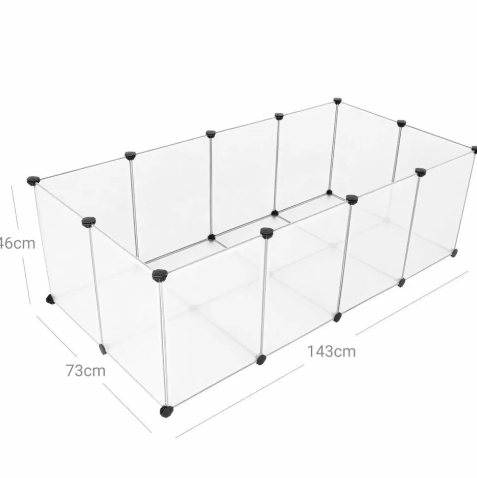 Offrez à vos petits animaux un espace sûr et agréable où ils peuvent courir, jouer et se reposer. Avec une surface de 0,98 m² et une hauteur de 45 cm, cet enclos est idéal pour les cochons d’Inde, lapins, hamsters et autres petits rongeurs. Ce modèle est équipé d’un fond pratique qui protège le sol contre la saleté et empêche vos compagnons de creuser ou de tenter de s’échapper. Grâce à cette base, l’enclos reste bien en place et plus difficile à déplacer par vos animaux. Les panneaux sont fabriqués en plastique PP robuste, recouvrant totalement les fils métalliques afin d’éviter qu’ils soient mordillés. Cette conception renforce la sécurité et assure que vos animaux restent bien protégés. Modulable, cet enclos peut être configuré selon vos besoins grâce aux accessoires de connexion astucieux. Vous pouvez l’adapter facilement à l’espace disponible et au confort de vos animaux. Transparent, il vous permet de garder un œil sur eux à tout moment. L’assemblage est simple et rapide : une notice illustrée, un maillet en caoutchouc et 30 serre-câbles sont fournis pour un montage sécurisé et stable. Facile d’entretien, l’enclos se nettoie simplement avec un chiffon humide. Couleur : Transparent Matériaux : Panneaux en plastique PP, accessoires de connexion en plastique ABS Dimensions du produit : 143 x 73 x 46 cm (L x l x H) Poids : 4,15 kg Contenu de la livraison : 12 x Panneau en plastique (45 x 35 cm) 8 x Panneau en plastique (35 x 35 cm) 27 x Accessoire de connexion 30 x Serre-câble 1 x Maillet en caoutchouc 175 g 1 x Notice de montage (FR, DE, EN, ES, IT) Précautions : Cet enclos est conçu pour les petits animaux (non adapté aux chiens ni aux chats). Assurez-vous que les coins des panneaux soient bien insérés dans les accessoires de connexion pour plus de stabilité. Reliez deux panneaux côte à côte avec 2 serre-câbles pour renforcer la structure. Ne vous asseyez pas sur le produit. Tenez-le éloigné des sources de chaleur et évitez une utilisation prolongée en extérieur.