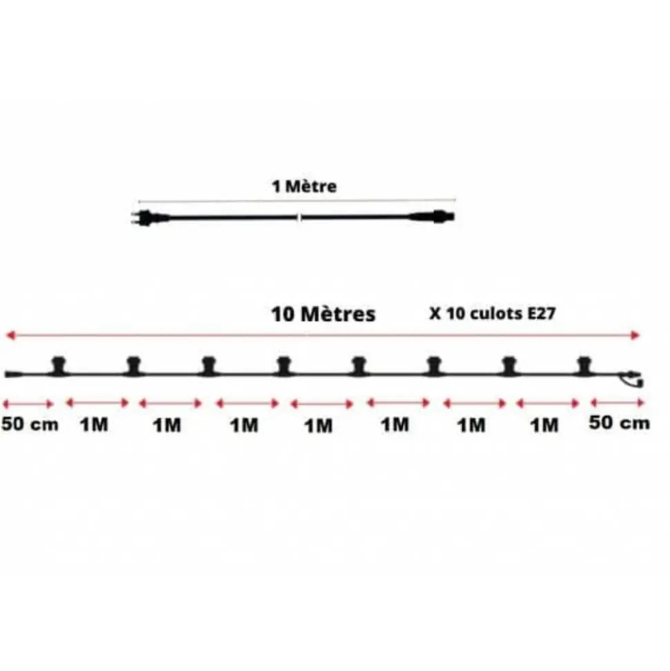 Transformez votre espace avec la Guirlande guinguette 10M et 10 ampoules LED E27 blanc chaud câble noir extensible, une solution d’éclairage polyvalente et élégante parfaite pour les environnements intérieurs et extérieurs avec un indice de protection IP44. Cette guirlande de 10 mètres est équipée de 10 ampoules LED blanc chaud, chacune avec une température de couleur de 2700 Kelvin, créant une atmosphère chaleureuse et accueillante.