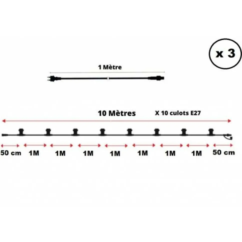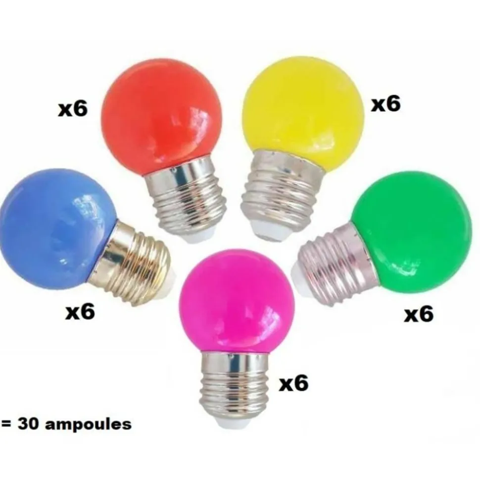 Illuminez vos espaces extérieurs avec notre vibrante Guirlande guinguette extérieur 30M 30 ampoules multicolores 1W LED E27 câble noir extensible. Cette guirlande de 30 mètres est dotée de 30 LED multicolores, chacune consommant seulement 1W, pour une une efficacité énergétique et un affichage éblouissant. Parfaite pour une utilisation intérieure et extérieure, cette lumière classée IP44 est conçue pour résister à diverses conditions météorologiques. Le câble noir s’intègre parfaitement à tout décor, tandis que la base E27 assure la compatibilité avec les prises standard.