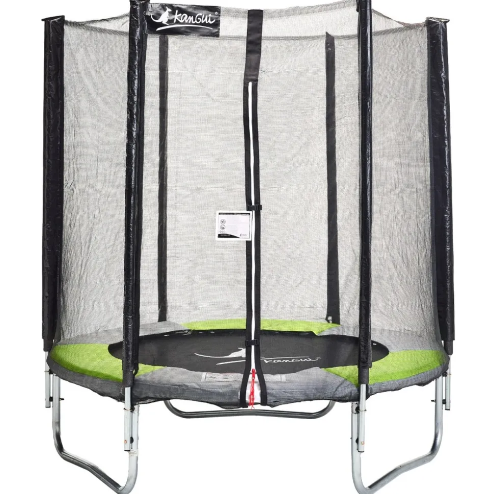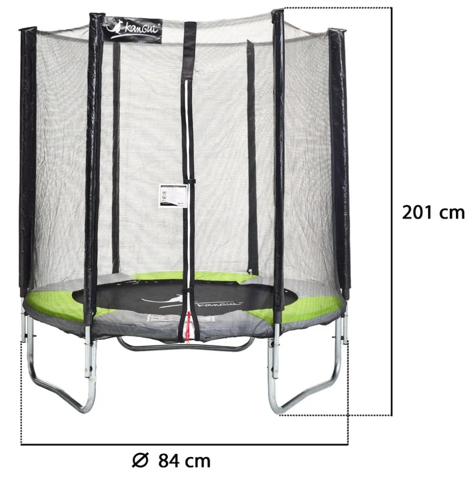 • Pour faire du sport sereinement, le trampoline est sécurisé par un filet haut (1,55m à partir du tapis) et à petites mailles pour éviter de passer même un petit doigt. L’accès au trampoline est facile grâce au zip de la porte. Sa petite cordelette rouge permet de vite repérer entrée et sortie.
