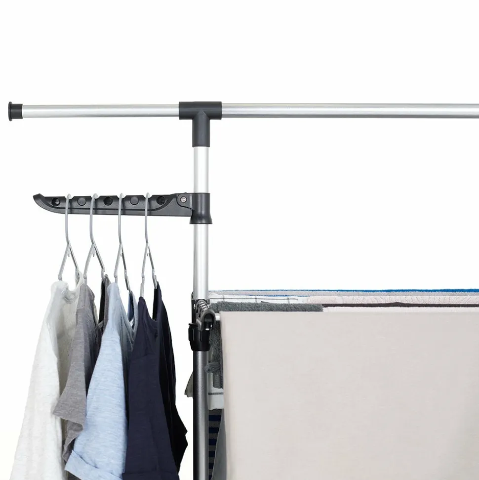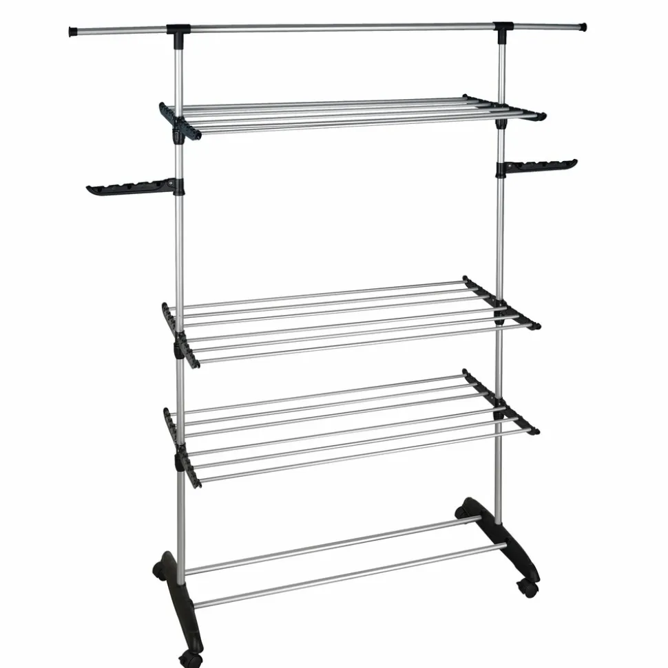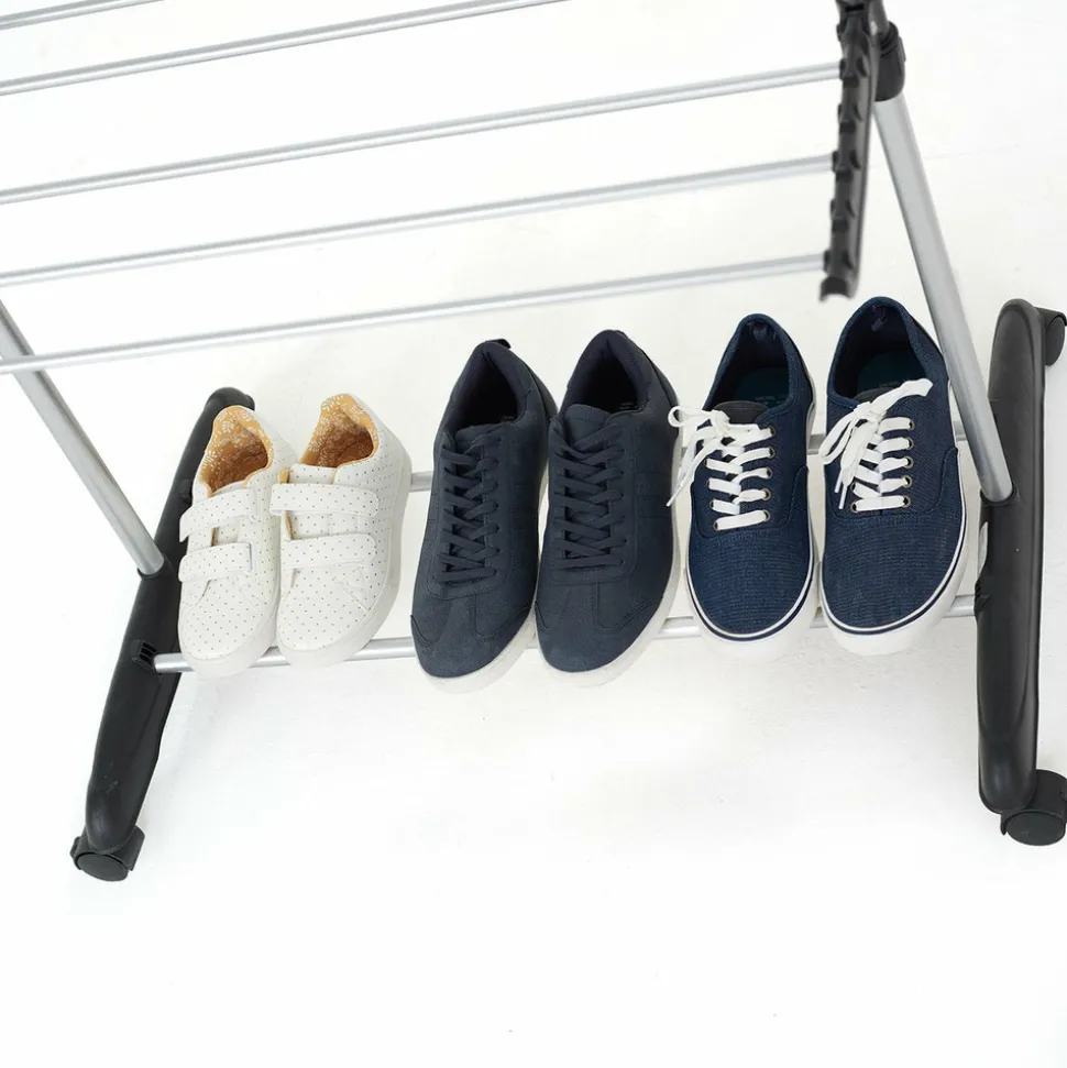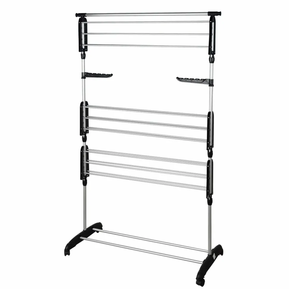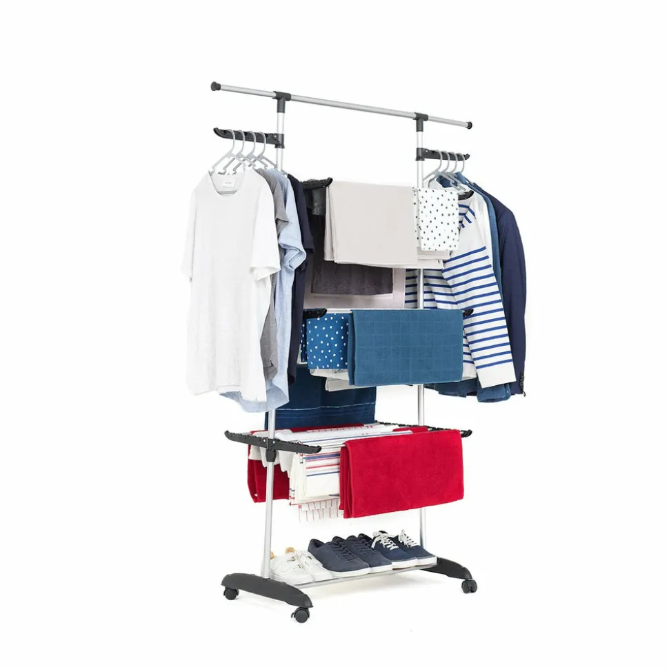 Étendoir à linge multifonction grande capacité, entièrement modulable, pratique grâce à ses portes cintres intégrés ! étendez jusqu’à 25 m de linge (équivalent 3 machines) sur 3 niveaux ! Idéal pour les familles nombreuses.Equipé de 2 portes-cintres, d’une barre d’extension pour étendre les draps et autres linges volumineux, d’une double barre support range chaussures et muni de 4 roulettes pour un déplacement aisé et une meilleure stabilité. Pieds extra-larges avec système anti-balancementTrès compact une fois replié, se range facilement. Installation en quelques secondes seulement. Capacité Record de 25m d’étendage. Large espace entre les barres pour une meilleure circulation de l’air et un séchage plus rapide. Installation facile et rapide (à assembler soi-même). Faible encombrement. Matière: barres en acier et montants en plastique.Ses nombreuses options de configuration ainsi que ses accessoires malins: porte cintre, barre d’extension, barres rétractables, roues orientables, en font l’un des séchoirs les plus polyvalent actuellement sur le marchéDimensions: hauteur 162 cm, longueur 120 (172 cm avec les barres extensibles), profondeur 50 cm ( et 10 cm une fois replié).