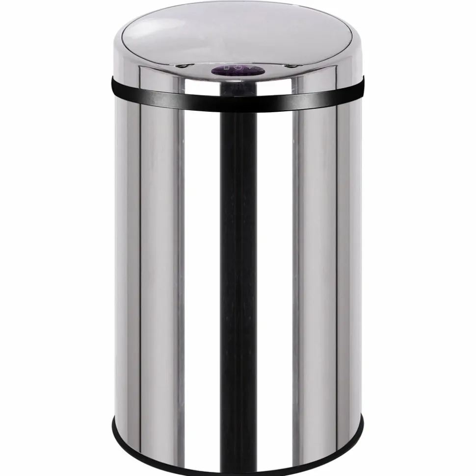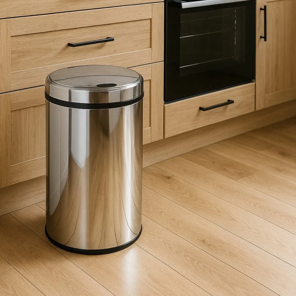 Poubelle de cuisine automatique 30LPoubelle de cuisine automatique ronde Capacité 30L, modèle ARTIC en acier inoxydable. Dimension: ∅31 x H56cm, poids : 3 kg. Finition inox poli miroir. Nouveau couvercle plus résistant avec témoin de batterie faible.Corps en INOX (0.4 mm) et couvercle en ABS. Fonctionne avec 4 piles LR06 (non fournies). Possibilité de brancher sur une prise secteur (adaptateur en option). Inclus : Un cerclage plastique pour maintenir votre sac poubelle, et un anneau au sol pour la protection des sols fragiles.Poubelle intelligente avec système infrarouge évitant tout contact avec le couvercle. Pratique et hygiénique, le couvercle s’ouvre et se referme automatiquement lorsque vous passez votre main ou un objet à 15 cm au-dessus de la cellule photoélectrique.Possibilité de maintenir le couvercle ouvert grâce aux boutons OPEN / CLOSE pour une ouverture prolongée. Matériaux lisses (fer inoxydable non-corrosif et ABS) facilitant l’entretien. Assemblage non requis.Plus qu’une poubelle, un meuble design : inutile de se baisser pour jeter vos déchets. Poubelle stable avec base antidérapante, fermeture silencieuse et finition anti-traces de doigts.