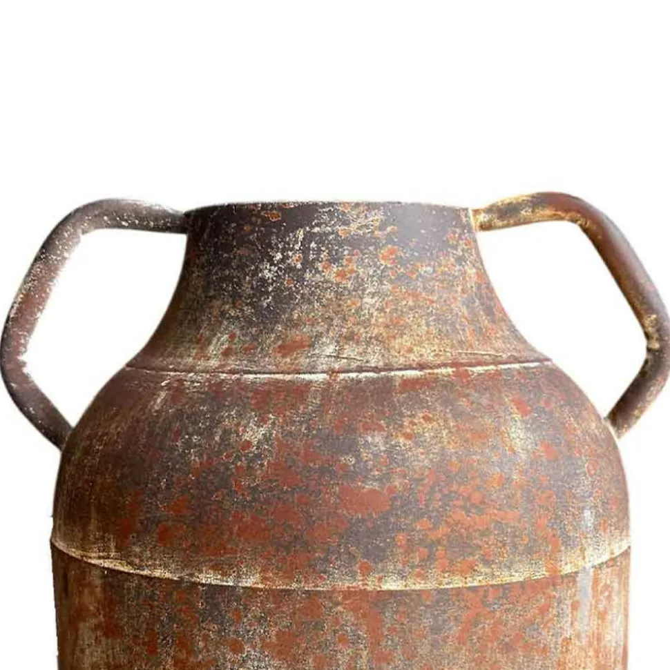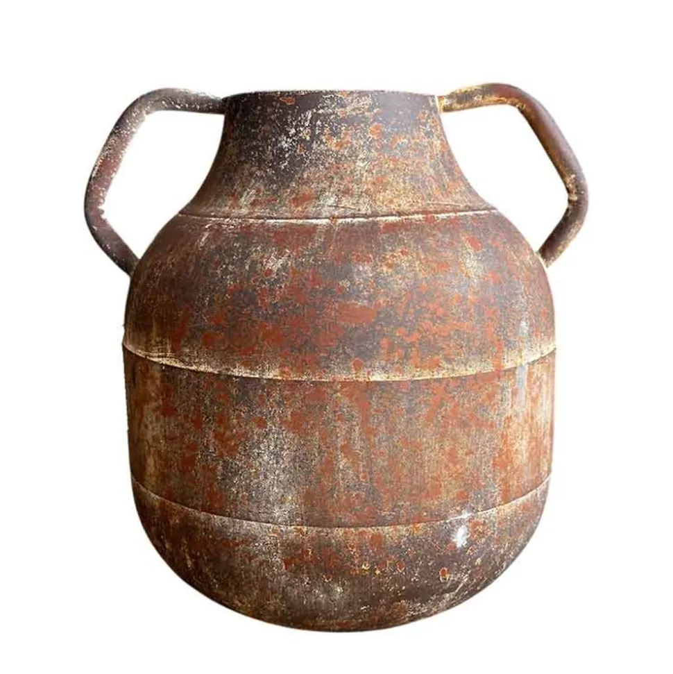 Ce superbe vase en fer robuste présente un charme antique et rustique grâce à sa surface entièrement rouillée.