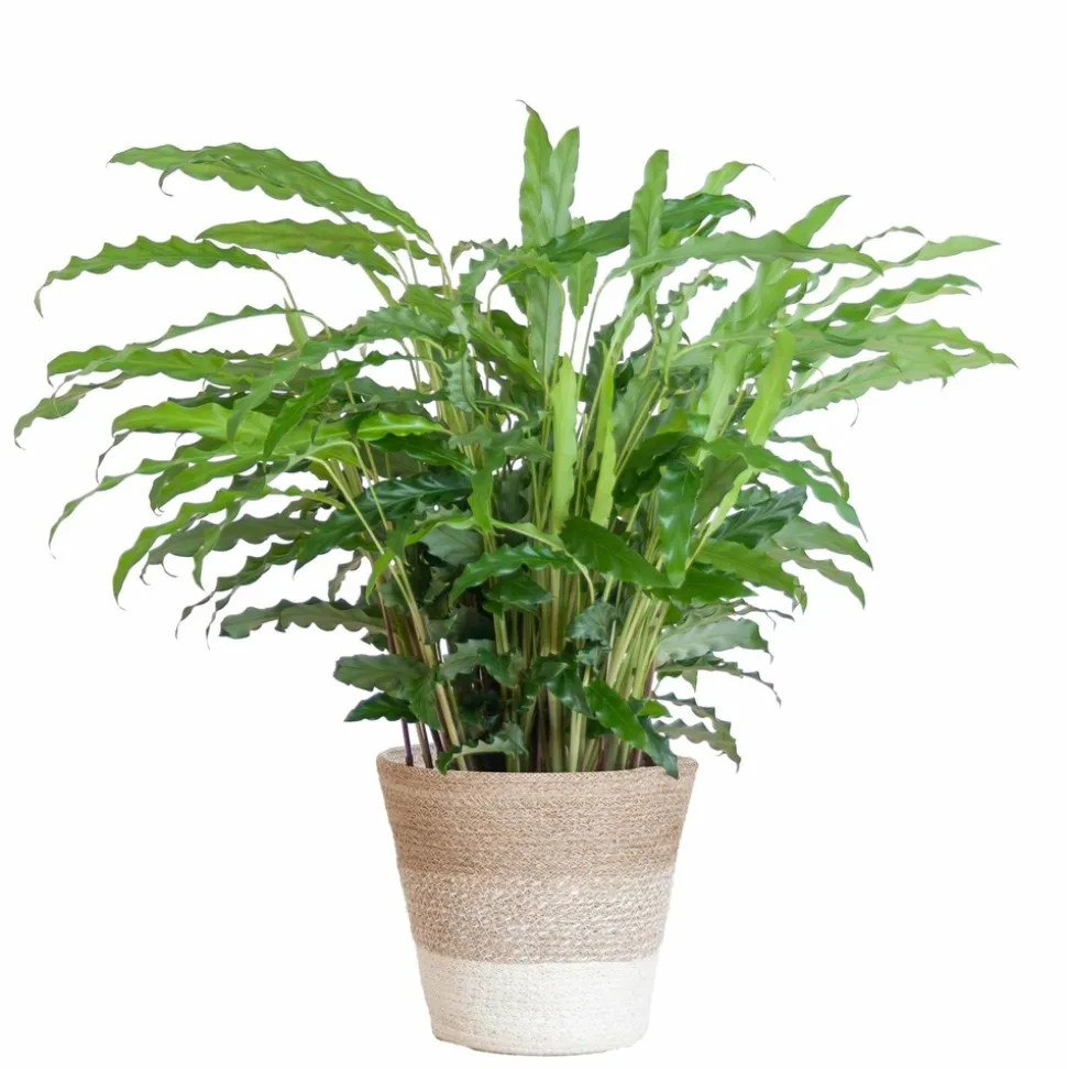 La Calathea Rufibarba, également surnommée la Calathea velours, est une plante d’intérieur remarquable grâce à ses longues feuilles fines à la texture veloutée. Originaire d’Amérique du Sud, elle pousse naturellement dans les environnements chauds et humides des forêts tropicales. Outre son apparence unique, cette plante est également prisée pour ses propriétés dépolluantes, purifiant l’air en absorbant les substances nocives et en libérant de l’oxygène.Le nom ‘Rufibarba’, qui signifie « plumes velues », fait référence à la texture douce et légèrement duveteuse de la face inférieure de ses feuilles. Cette caractéristique aide la plante à retenir l’humidité, rendant ses soins relativement faciles. La Calathea Rufibarba préfère un emplacement en mi-ombre et nécessite des arrosages réguliers mais modérés, ce qui en fait un excellent choix pour les débutants comme pour les amateurs de plantes expérimentés.Pour mettre en valeur cette plante, vous aurez le choix entre plusieurs cache-pots décoratifs, dont le panier naturel Sofia, fabriqué en herbes marines séchées et tressées. Avec sa doublure en plastique étanche et sa teinte beige naturelle, ce pot s’accorde parfaitement avec le feuillage luxuriant de la Calathea. Vous pouvez également opter pour d’autres styles de cache-pots pour personnaliser votre décoration intérieure.Ajoutez une touche naturelle et élégante à votre intérieur avec cette combinaison de plante et de cache-pot au choix, idéale pour transformer votre espace en un havre de paix tropical.