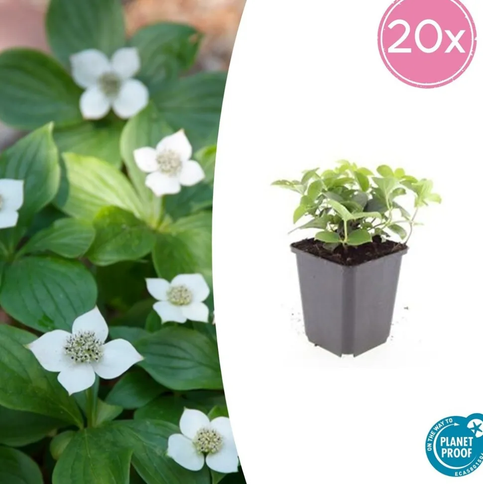 Les Cornouiller du Canada sont vendues par lot de 20 pots qui mesurent 9 cm et 10-25 cm de hauteur. Cornus canadensis : un couvre-sol fleuri et rustique pour sublimer votre jardin——————————————————————————-Découvrez le Cornus canadensis, appelé aussi Quatre-temps du Canada, un magnifique couvre-sol rustique idéal pour apporter couleur et vitalité à vos espaces extérieurs. Facile d’entretien et particulièrement robuste face au froid, cette vivace tapissante offre une floraison délicate au charme unique.Origines du Cornus canadensisLe Cornus canadensis est typique des régions boisées d’Amérique du Nord, particulièrement du Canada et du nord-est des États-Unis. Cette petite vivace sauvage pousse naturellement dans les sous-bois humides et frais où elle forme de véritables tapis végétaux au pied des arbres et arbustes.Description physique du Cornus canadensisCette espèce couvre-sol, atteignant une hauteur de 10 à 20 cm maximum, possède un feuillage vert brillant qui vire au rouge pourpre à l’automne. Au printemps et au début de l’été, le Cornus canadensis produit de petites fleurs blanches regroupées par quatre et entourées de bractées décoratives suivies de baies rouges attractives. Son port tapissant régulier en fait une solution esthétique parfaite pour recouvrir les massifs ombragés.À saisir dès maintenant ! Commandez votre Cornus canadensis en lot et profitez de tarifs dégressifs avantageux pour végétaliser facilement votre jardin.