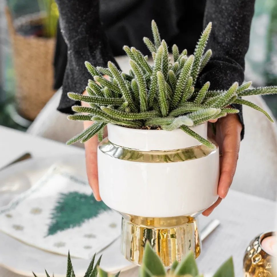 Complétez votre intérieur chic avec cet ensemble Le Chic ! Il s »agit d »un ensemble de deux Rhipsalisses différents. Les plantes vertes sont dans l »élégant pot Le Chic. Ce pot est blanc et se reconnaît aux détails dorés. Le pot a une surface lisse et une taille de pot de 9 cm. Conseils d »entretien Rhipsalis Le Rhipsalis est une plante d »intérieur facile. Cette plante peut facilement passer une semaine sans eau et a de faibles besoins en intensité lumineuse. Attention à ne pas arroser la plante avec un grand seau d »eau. Si vous donnez trop d »eau à un Rhipsalis, les racines pourriront. Si les succulentes ne survivent pas, c »est souvent la cause. Pas besoin d »avoir la main verte ! C »est une plante vigoureuse dont l »entretien est relativement facile. emballage et livraison Nos plantes vous sont livrées directement de notre pépinière. Ils sont emballés dans un carton d »expédition spécialement conçu pour garantir que les plantes et les pots ne soient pas endommagés pendant le transport. *Parce que nous travaillons avec des produits vivants, les espèces présentées peuvent différer légèrement des photos.