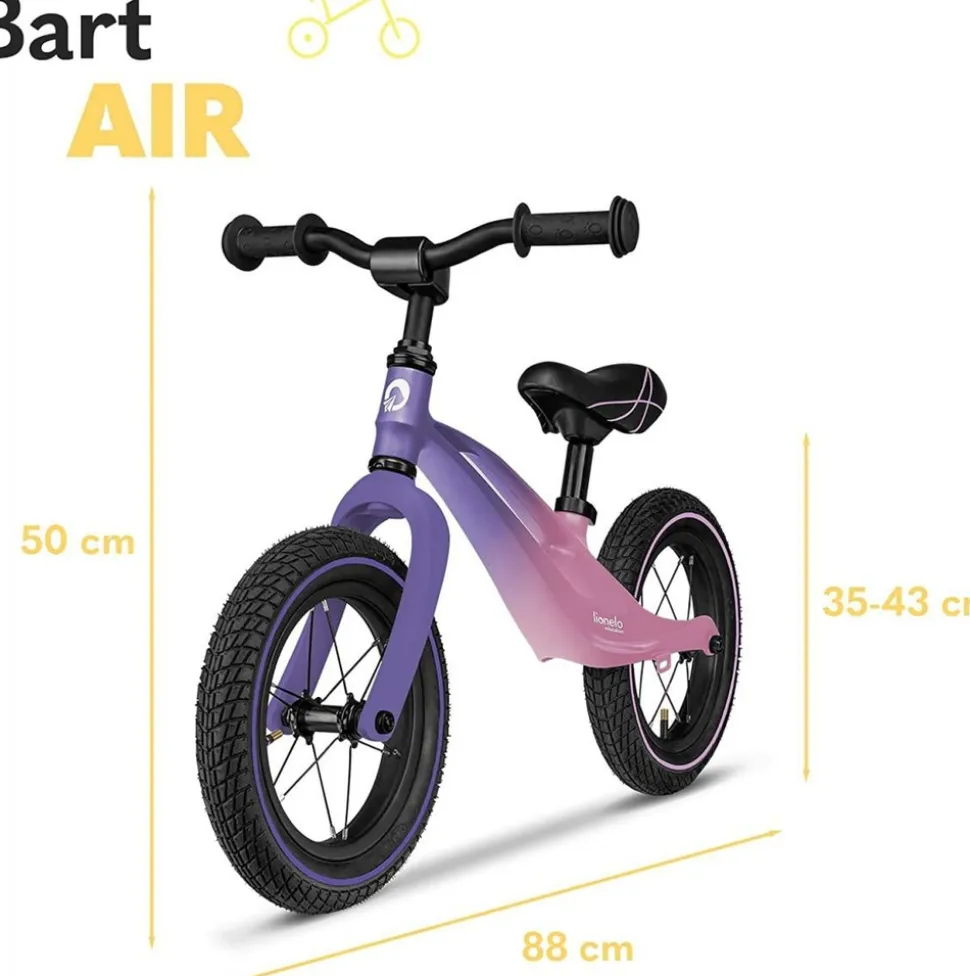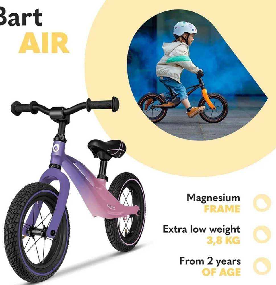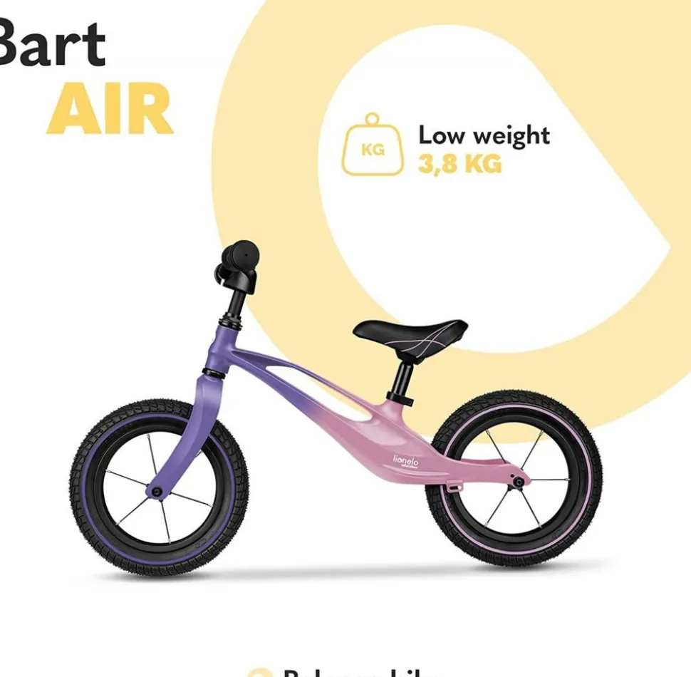 Cadre de la meilleure qualité La construction du vélo Bart Air est basée sur un cadre coulé sous pression en alliage de magnésium. Grâce à cela, le véhicule est de 75 % plus léger que les produits similaires avec un cadre en acier. La construction fabriquée en technologie sans joints soudés dispose d’une durabilité et d’une résistance aux dégâts plus élevées, et les propriétés de suppression de la matière primaire lui permettent d’agir comme un amortisseur naturel. Bart Air est un produit éducatif sûr pour les enfants, ce qui est confirmé par une série de contrôles internes et le certificat du laboratoire de recherches SGS. Le vélo répond aux exigences de la norme de sécurité européenne EN 71. Roues pompées à 12 pouces La draisienne Bart Air est muni de roues pompées à 12 pouces avec une bande de roulement assurant une excellente adhérence et man?uvrabilité. Des chambres à air et des pneus durables, des éléments solides de fixation en métal, des paliers en acier et des jantes ? tous ces composants garantissent la haute résistance du produit aux dégâts. Guidon et selle réglables Les réglages du guidon et de la selle dans le modèle Bart Air font qu’il est facile d’adapter ses paramètres aux besoins des enfants à tailles différentes. Grâce aux manchons antidérapants mis sur les poignées, le guidage du vélo devient plus facile, et le blocage de braquage limite considérablement le risque de contusion. La cadre de véhicule a été muni d’un élément embouti léger remplissant le rôle de repose-pieds. Transport facile et design dynamique Bart Air se distingue par une ligne sportive à bords profilés qui empêchent les écorchures ou les bleus éventuels pendant l’utilisation. Un ajour impressionnant dans le cadre sert comme une poignée pour porter le véhicule. Un poids bas et une grande maniabilité permettent de prendre le vélo tant pour une promenade au parc, qu’en vacances.