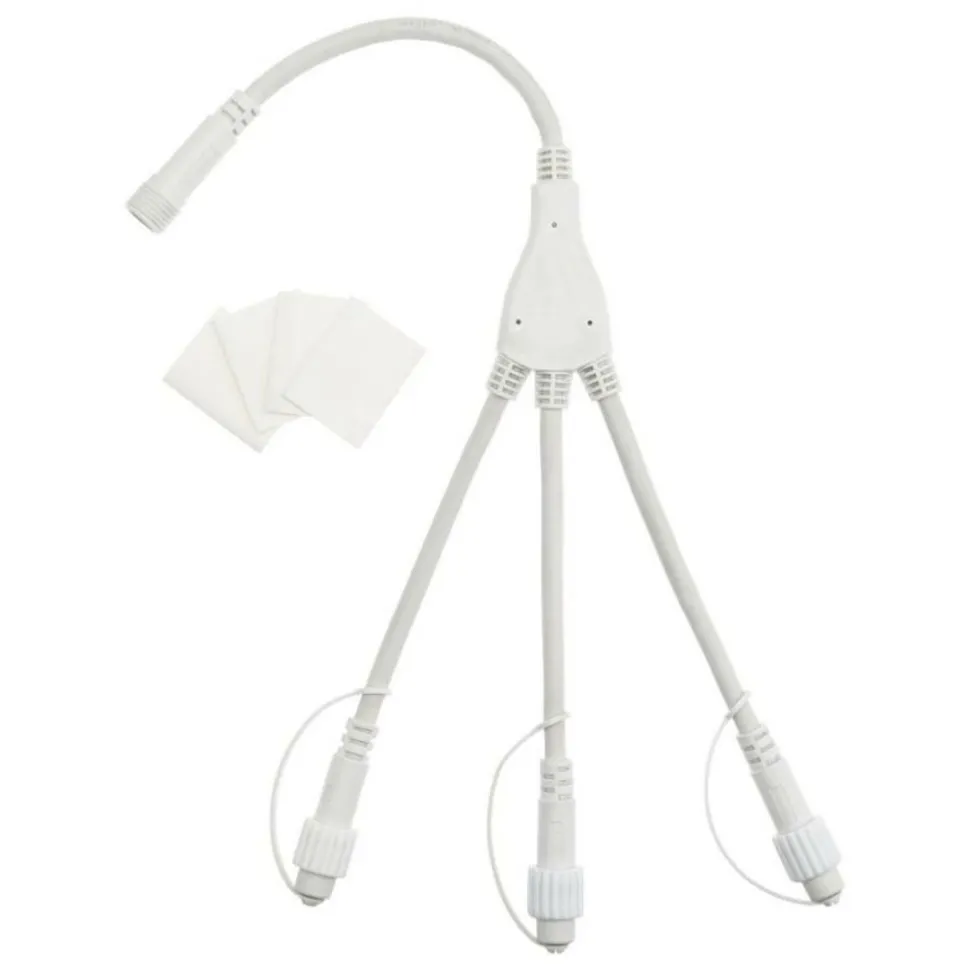 Connecteur Multiple 3 sorties 2×1.5 230V AC, 1 Connecteur entrée Mâle et 3 Connecteurs sortie Femelle, Accessoire PL E27 Professional 2pins, Portée Max 1500W, utilisation Extérieur, Câble Caoutchouc Blanc 2×1,5mm2, Dimensions 15+3x15cm, Sachet avec Carton accrochable EcoPack (XPLE Art. M-CON3 2×1.5 B).