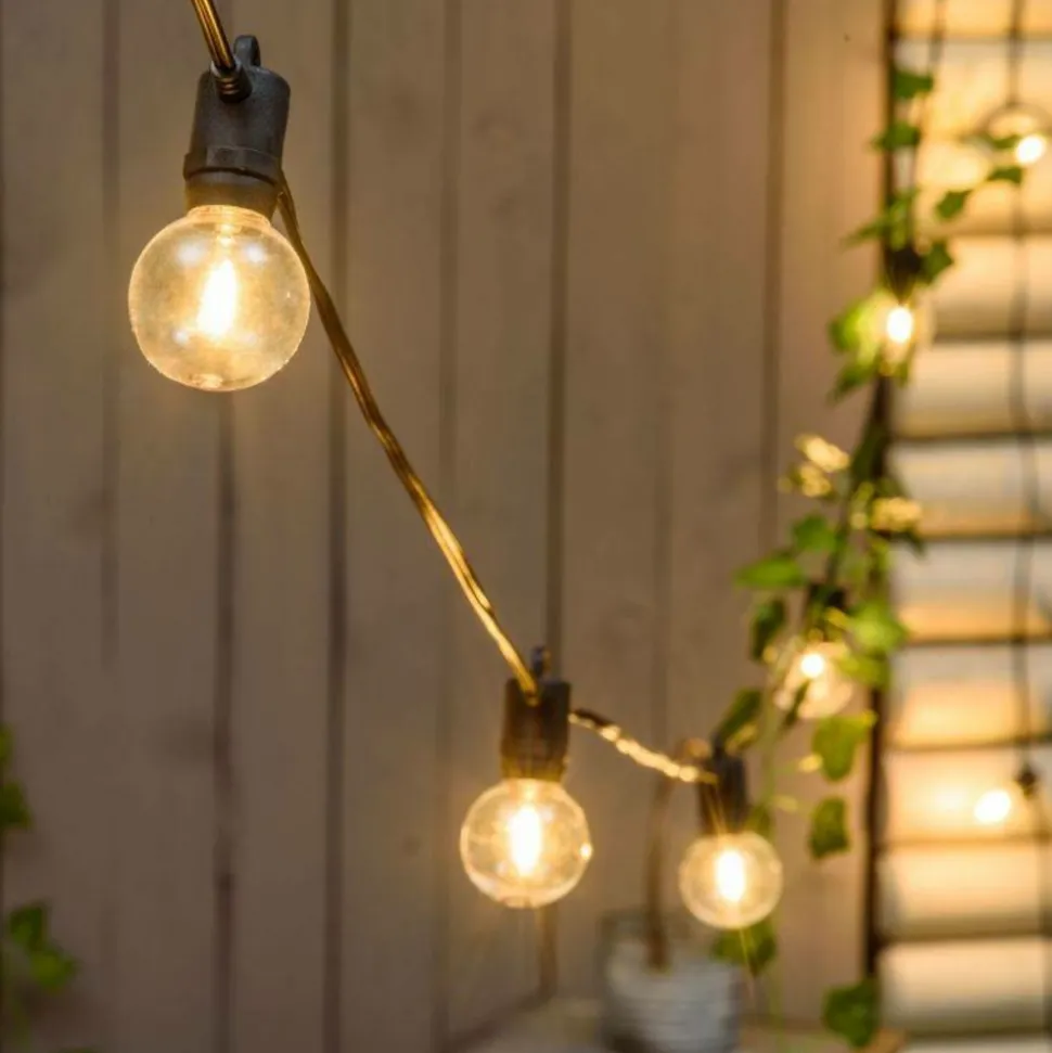 Guirlande Solaire décorée 5m Party Light 12 Ampoules en Plastique Transparent Antichoc E12 Globe G40 Filament LED BLANC CHAUD Ø40mm, Filament LED Simple, Ampoules Remplaçables (1 Ampoule de rechange incluse), Feu Fixe, avec 1×18650 3.7V 1200mAh Li-ion Rechargeable Batterie incluse et non remplaçable, Panneau solaire 4,5V 250mA avec bouton ON-OFF et capteur de luminosité, Utilisation Extérieure, Câble noir, Dimensions 2,5+5m, Boîte couleur luxe (XKC Art. 12L-E12-G40-F SP).