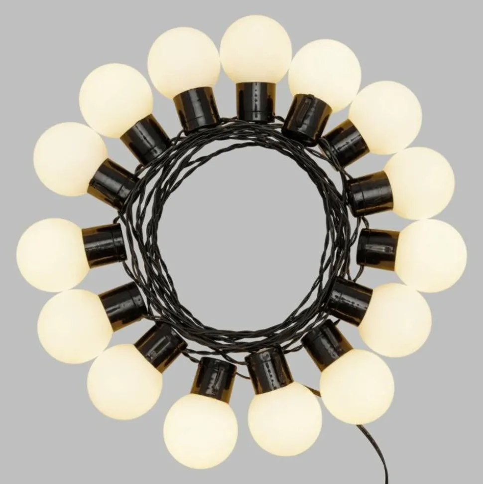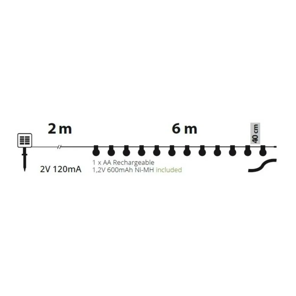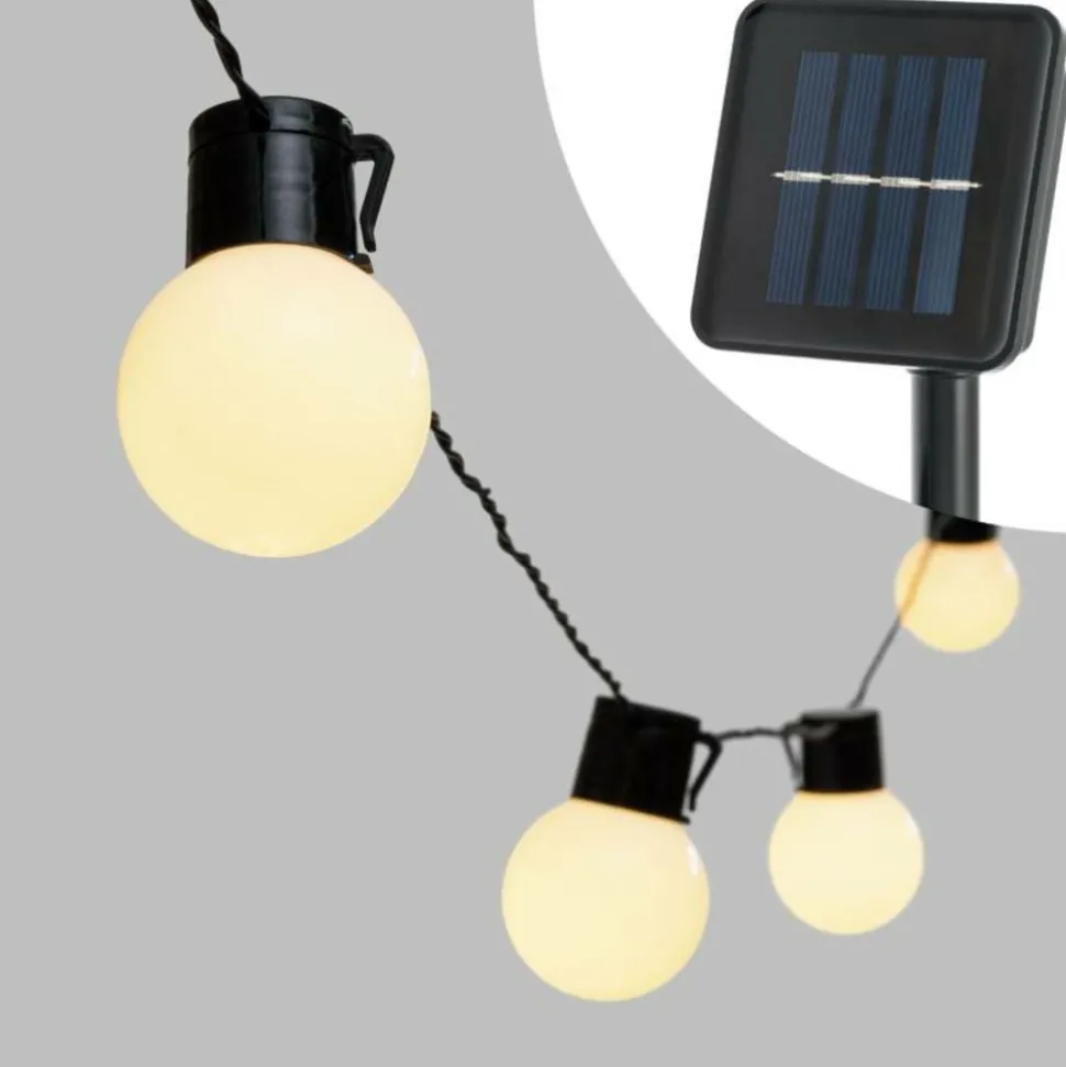 Guirlande Solaire 6m Party Light 15 Ampoules G50 Plastique Blanc 15 SuperLED BLANC CHAUD Ø50xH60mm, Lumière Fixe, Bouton ON-OFF et Capteur de Luminosité, Batterie Rechargeable AA 1.2V 600mAh Ni-MH Incluse et Non Remplaçable, Panneau Solaire 2V 120mA, Usage Externe , Câble Noir, Dimensions 2+6m, Boîte Couleur (XKC Art. 15L G50-F N 6M SP).