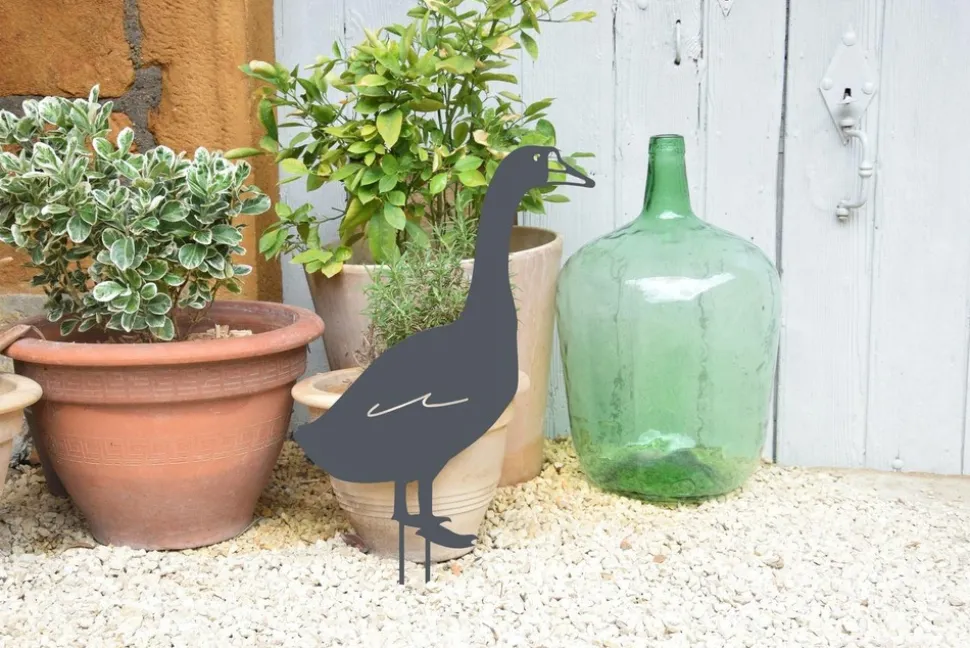 Cette figurine Oie à piquer dans la terre en pot ou en massif est parfait pour donner un peu de gaieté et de vie à votre espace extérieur. Cette figurine mesure 50 cm de haut hors sol et 34 cm de large. Fabrication française. Acier époxy résistant au gel et UV.