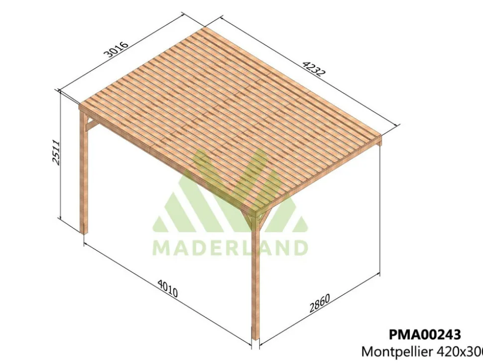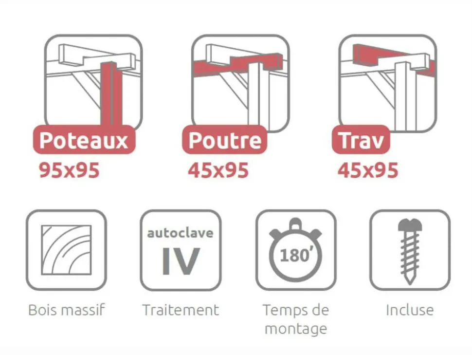 La quantité de poteaux, de poutres et de traverses peut varier en fonction des dimensions choisies, cette pergola a 2 poteaux, 1 poutre porteuse, 1 poutre de mur et 6 traverses.