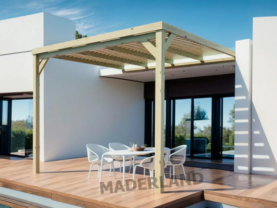 La pergola adossée Montpellier est idéale pour profiter de votre extérieur en été. Son toit en lames espacées de 3 cm filtre la lumière pour créer un espace ombragé et agréable.