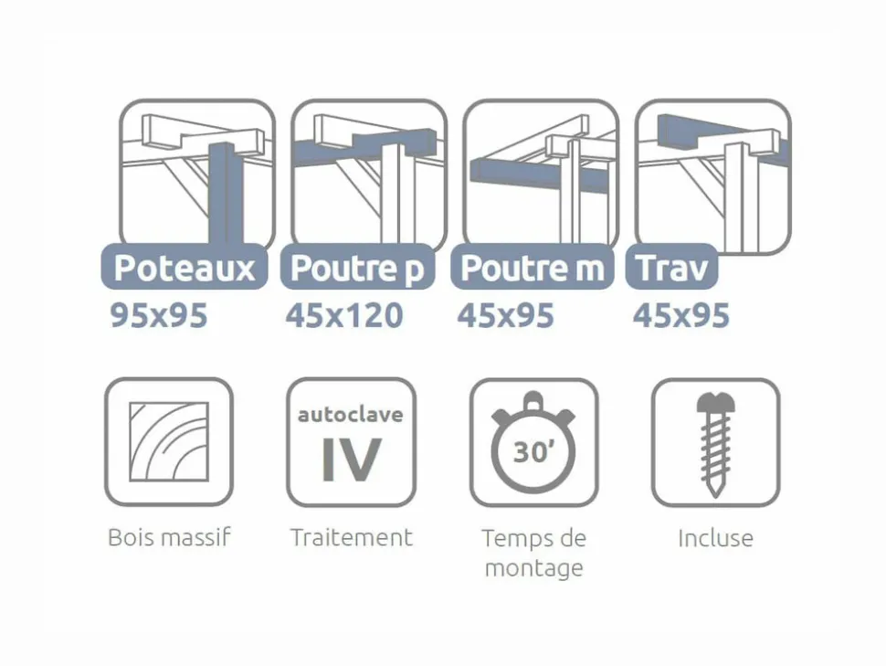 Cette pergola est équipée de 3 poteaux, 4 poutres porteuses, 2 poutres de mur et 9 traverses, garantissant une structure robuste et stable. Les poutres porteuses jouent un rôle essentiel dans la solidité de l鈥檈nsemble.