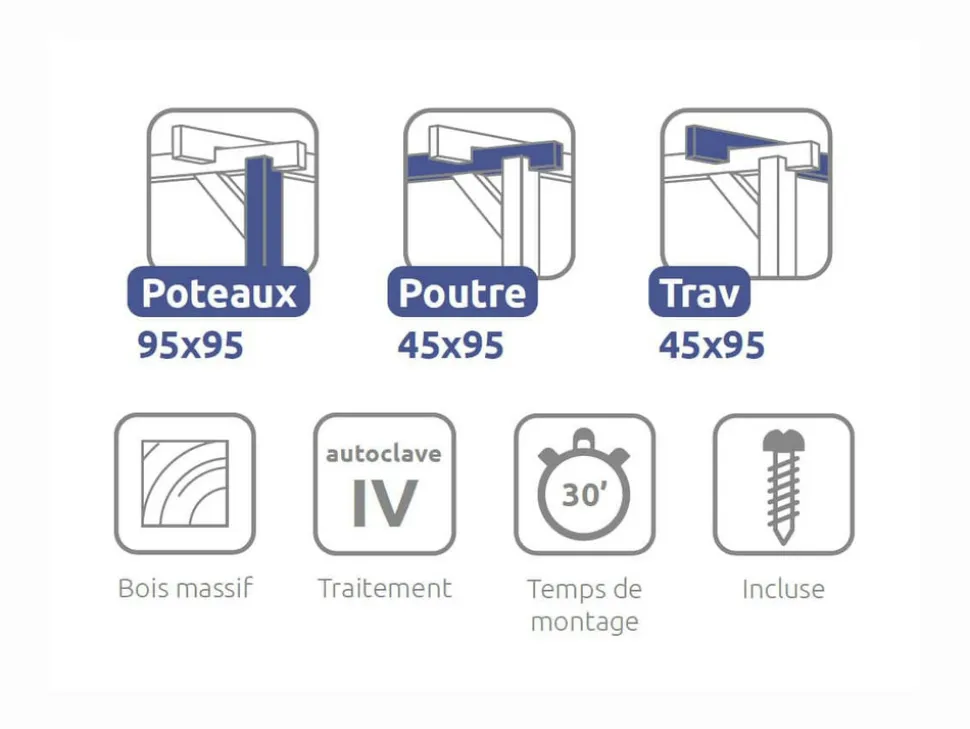 Cette pergola dispose de 4 poteaux, 2 poutres et 6 traverses, assurant une structure stable et robuste. Plus la section du bois est importante, plus la solidité est renforcée, offrant ainsi une protection optimale contre les éléments extérieurs.
