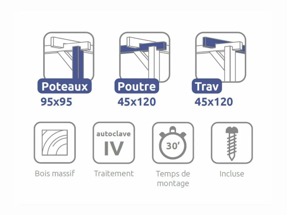 Fabriquée en bois massif du nord de l鈥橢urope, cette pergola bénéficie d鈥檜n bois à croissance lente, offrant une meilleure résistance à la flexion, à la compression et à la traction. Sa structure comprend 4 poteaux, 2 poutres et 7 traverses, garantissant une excellente stabilité.