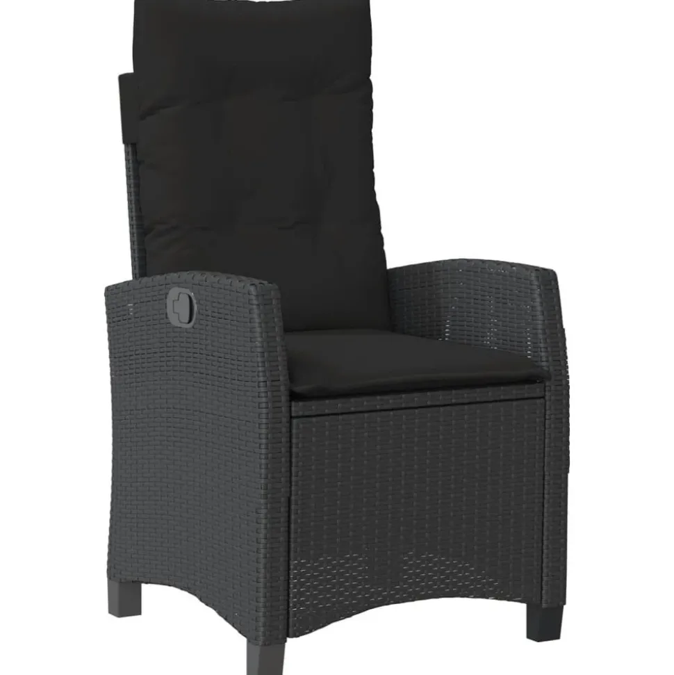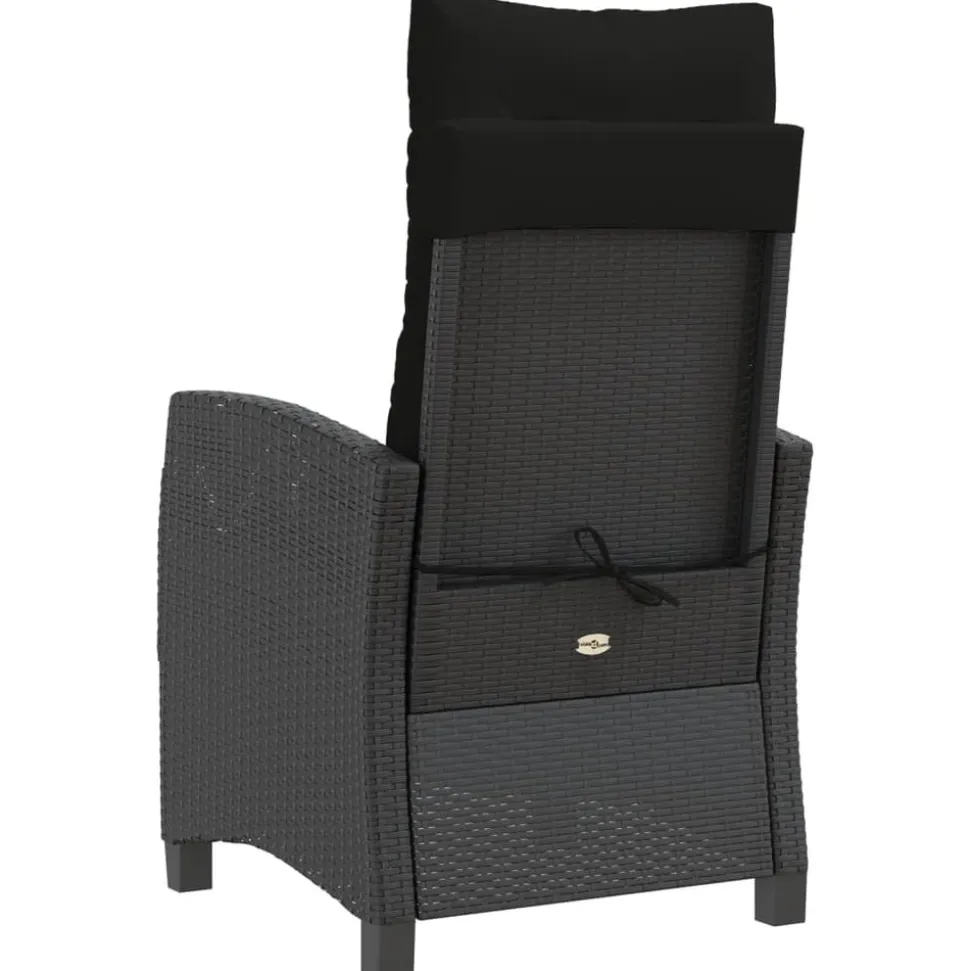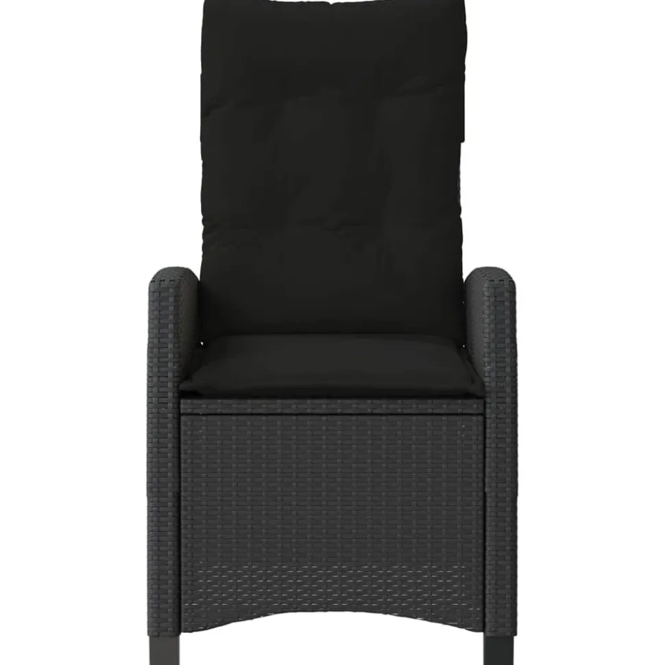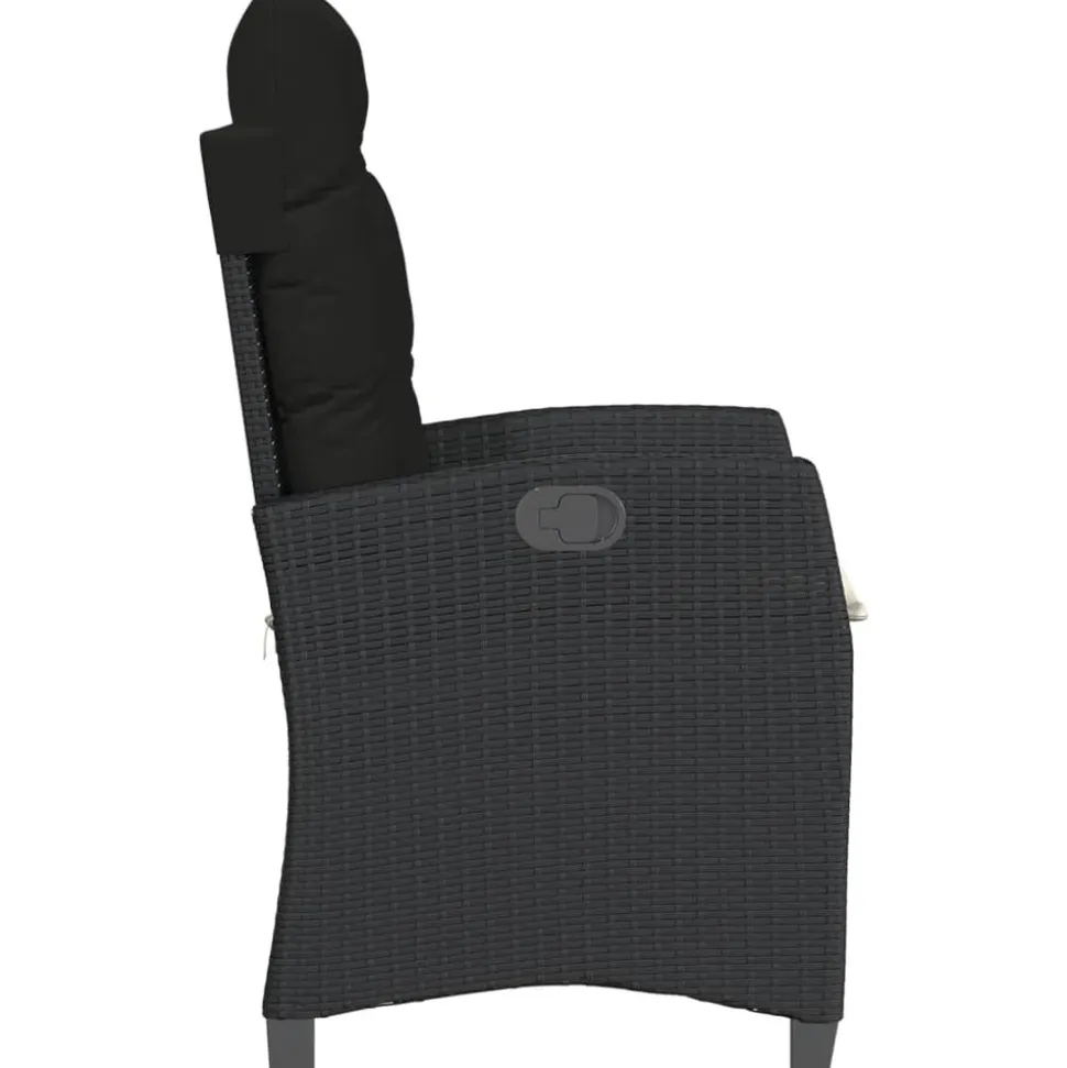 Chaise :Couleur : noirMatériau : résine tressée, acier enduit de poudreDimensions de l’assise : 57 x 66 x 93 cm (l x P x H)Dimensions de couchage : 57 x 90 x 83 cm (l x P x H)Dimensions du siège : 48 x 54 cm (l x P)Hauteur du siège à partir du sol : 43,5 cmHauteur des accoudoirs à partir du sol : 62 cmCapacité de charge maximale (par siège) : 110 kgRésistance aux UVAssemblage requis : ouiCoussin :Couleur : noirMatériau de la couverture : tissu (100 % polyester)Matériau de remplissage du coussin de siège : mousseMatériau de remplissage du coussin de dossier : fibre de cotonDimensions du coussin de siège : 48 x 54 x 3 cm (l x P x é)Dimensions du coussin de dossier : 48 x 67 x 11 cm (l x P x é) La livraison contient :1 x chaise de jardin inclinable1 x coussin d’assise avec housse amovible et lavable1 x coussin de dossier Maximum 110 kg par siège. Soyez conscient du risque de feux ouverts et d’autres sources de forte chaleur à proximité du produit.