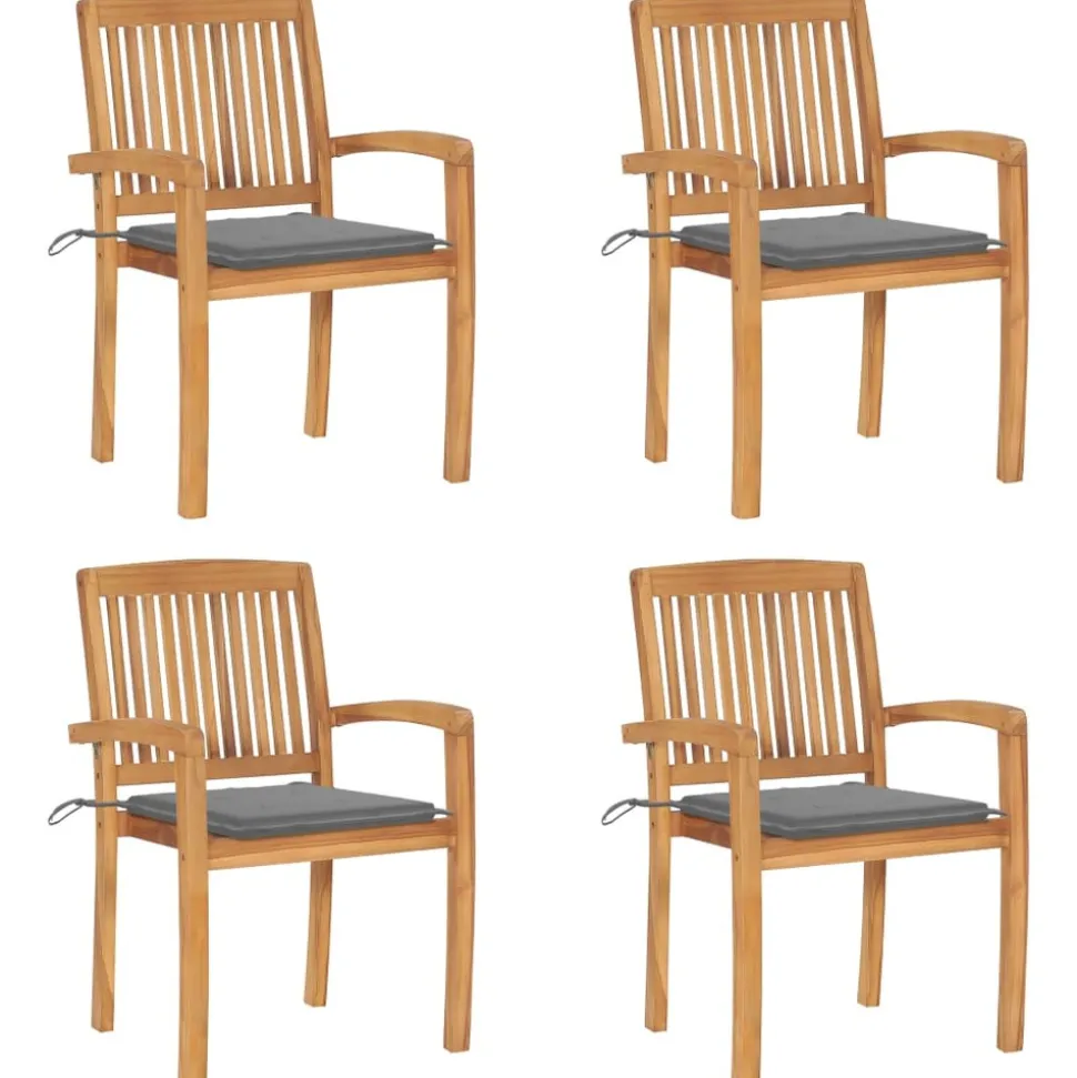 Ajoutez une touche de charme rustique à votre salle à manger, jardin ou terrasse avec cet ensemble de chaises de jardin empilables avec ensemble de coussins ! La chaise de salle à manger élève votre espace de vie intérieur ou extérieur à un niveau supérieur avec un design à lattes et élégant. Cet ensemble de meubles en teck est fabriqué à partir de bois dur de teck extrêmement durable et est chevronné, séché au four et poncé finement pour lui donner un aspect très lisse. Le bois de teck est connu pour sa solidité et sa résistance aux intempéries exceptionnelles, ce qui le rend bien plus adapté aux meubles de jardin que tout autre type de bois. Le bois de teck est le choix parfait si vous souhaitez acheter un meuble de jardin durable. Il est facile à entretenir et à nettoyer avec un chiffon humide. De plus, la chaise de salle à manger peut être empilée pour économiser de l’espace de stockage lorsqu’elle n’est pas utilisée. De plus, les coussins inclus offrent un confort supplémentaire. Chaque coussin a 2 jeux de cordes pour le fixer fermement sur la chaise. Remarque : afin de prolonger la durée de vie de vos meubles d’extérieur, nous vous recommandons de les nettoyer régulièrement et de ne pas les laisser à l’extérieur sans protection inutilement.Nettoyage : utiliser une solution savonneuse douceStockage : si possible, stockez dans un endroit frais et sec à l’intérieur. Si le produit est stocké à l’extérieur, protégez-le avec une housse imperméable. Essuyez et séchez l’excès d’eau ou de neige des surfaces planes après la pluie ou une chute de neige. Permettez une circulation d’air suffisante afin d’éviter les dommages liés à l’humidité.
