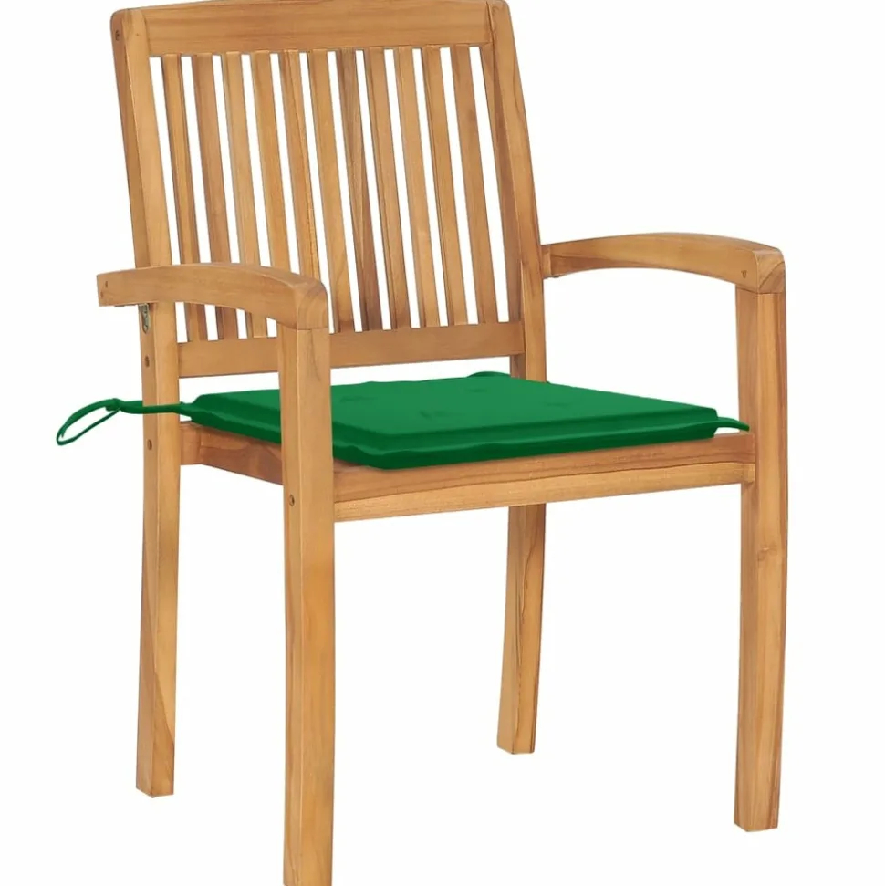 Ajoutez une touche de charme rustique à votre salle à manger, jardin ou terrasse avec cet ensemble de chaises de jardin empilables avec ensemble de coussins ! La chaise de salle à manger élève votre espace de vie intérieur ou extérieur à un niveau supérieur avec un design à lattes et élégant. Cet ensemble de meubles en teck est fabriqué à partir de bois dur de teck extrêmement durable et est chevronné, séché au four et poncé finement pour lui donner un aspect très lisse. Le bois de teck est connu pour sa solidité et sa résistance aux intempéries exceptionnelles, ce qui le rend bien plus adapté aux meubles de jardin que tout autre type de bois. Le bois de teck est le choix parfait si vous souhaitez acheter un meuble de jardin durable. Il est facile à entretenir et à nettoyer avec un chiffon humide. De plus, la chaise de salle à manger peut être empilée pour économiser de l’espace de stockage lorsqu’elle n’est pas utilisée. De plus, les coussins inclus offrent un confort supplémentaire. Chaque coussin a 2 jeux de cordes pour le fixer fermement sur la chaise. Remarque : afin de prolonger la durée de vie de vos meubles d’extérieur, nous vous recommandons de les nettoyer régulièrement et de ne pas les laisser à l’extérieur sans protection inutilement.Nettoyage : utiliser une solution savonneuse douceStockage : si possible, stockez dans un endroit frais et sec à l’intérieur. Si le produit est stocké à l’extérieur, protégez-le avec une housse imperméable. Essuyez et séchez l’excès d’eau ou de neige des surfaces planes après la pluie ou une chute de neige. Permettez une circulation d’air suffisante afin d’éviter les dommages liés à l’humidité.