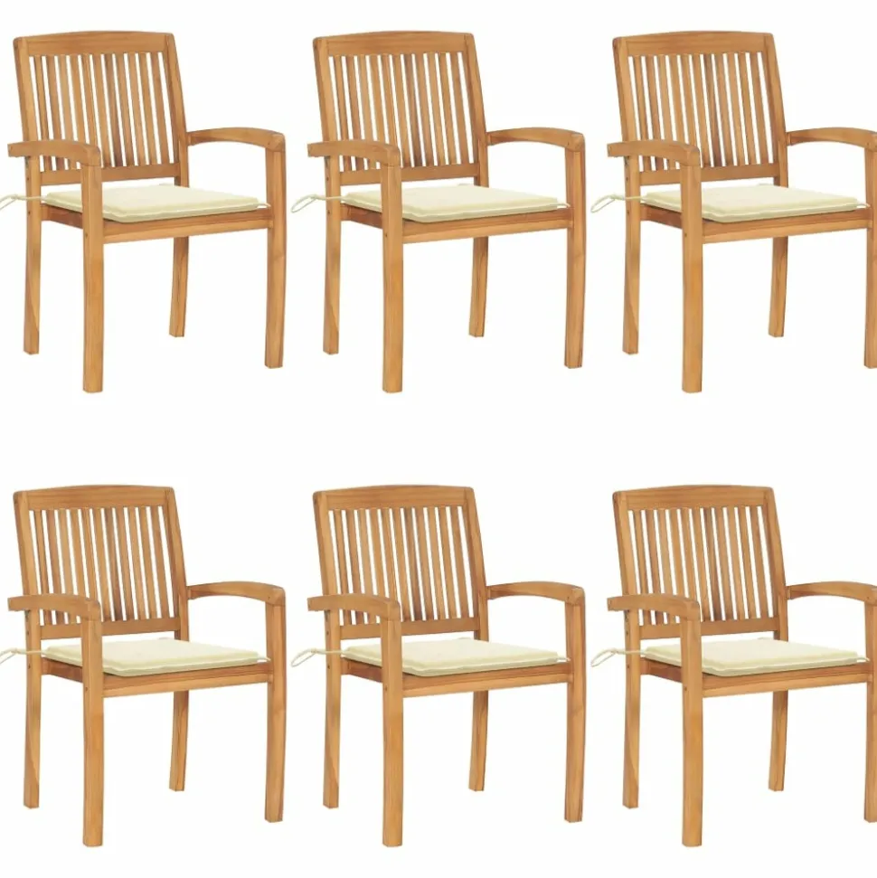 Ajoutez une touche de charme rustique à votre salle à manger, jardin ou terrasse avec cet ensemble de chaises de jardin empilables avec ensemble de coussins ! La chaise de salle à manger élève votre espace de vie intérieur ou extérieur à un niveau supérieur avec un design à lattes et élégant. Cet ensemble de meubles en teck est fabriqué à partir de bois dur de teck extrêmement durable et est chevronné, séché au four et poncé finement pour lui donner un aspect très lisse. Le bois de teck est connu pour sa solidité et sa résistance aux intempéries exceptionnelles, ce qui le rend bien plus adapté aux meubles de jardin que tout autre type de bois. Le bois de teck est le choix parfait si vous souhaitez acheter un meuble de jardin durable. Il est facile à entretenir et à nettoyer avec un chiffon humide. De plus, la chaise de salle à manger peut être empilée pour économiser de l’espace de stockage lorsqu’elle n’est pas utilisée. De plus, les coussins inclus offrent un confort supplémentaire. Chaque coussin a 2 jeux de cordes pour le fixer fermement sur la chaise. Remarque : afin de prolonger la durée de vie de vos meubles d’extérieur, nous vous recommandons de les nettoyer régulièrement et de ne pas les laisser à l’extérieur sans protection inutilement.Nettoyage : utiliser une solution savonneuse douceStockage : si possible, stockez dans un endroit frais et sec à l’intérieur. Si le produit est stocké à l’extérieur, protégez-le avec une housse imperméable. Essuyez et séchez l’excès d’eau ou de neige des surfaces planes après la pluie ou une chute de neige. Permettez une circulation d’air suffisante afin d’éviter les dommages liés à l’humidité.