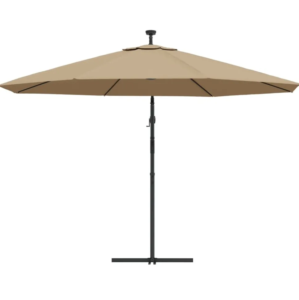 Cet élégant parasol suspendu avec lumières LED est parfait pour créer de l’ombre et vous protéger des rayons UV nocifs. Fabriquée en polyester anti-UV et anti-décoloration, la couverture de parasol vous offre une protection optimale contre le soleil et est facile à nettoyer. Il dispose de 24 LED à énergie solaire pour éclairer automatiquement votre espace de vie extérieure et créer une ambiance chaleureuse et romantique quand le soleil se couche. Il est également livré avec une base croisée robuste pour ajouter de la stabilité. Le design exclusif de ce parasol vous permet d’incliner le parasol pour bloquer le soleil qui se dirige vers l’horizon. Le poteau en métal résistant, ainsi que les 8 nervures durables, rendent le parasol très stable et durable. Notre parasol de jardin peut être ouvert et fermé facilement grâce au mécanisme à manivelle. L’article est facile à assembler. Veuillez noter que nous vous recommandons de traiter le tissu du parasol avec un spray imperméabilisant s’il est soumis à des fortes précipitations.